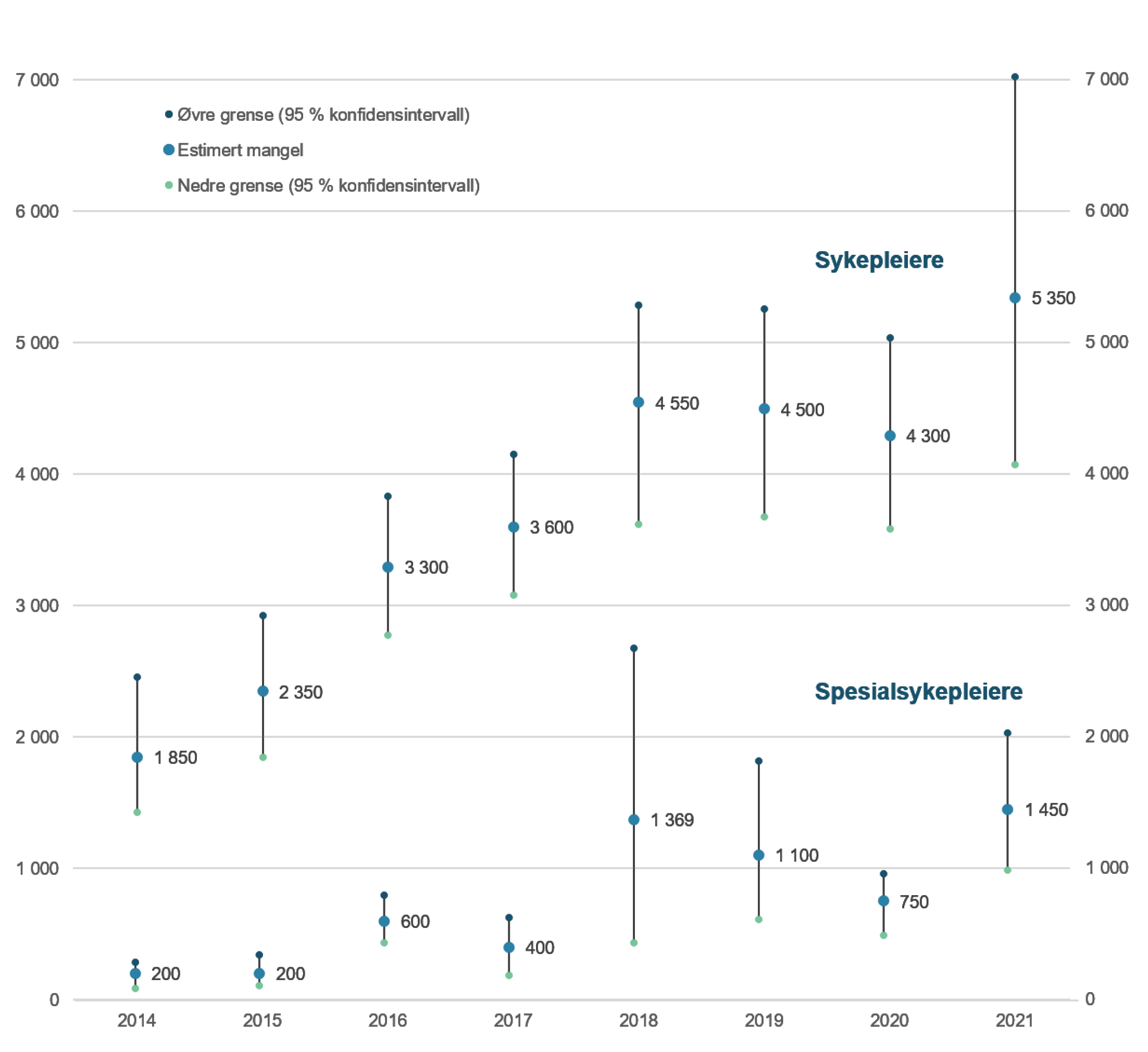 Kilde: NAVs bedriftsundersøkelse 2021. Tallene for observert mangel, som danner grunnlaget for estimert mangel, gir kun informasjon om den observerte mangelen blant årets respondenter og bør ikke leses isolert. Mangelen innen "institusjoner og bofellesskap innen omsorg for eldre og funksjonshemmede" inkluderer mangel i bofellesskap for psykisk utviklingshemmede, bofellesskap for eldre og funksjonshemmede med fast tilknyttet personell hele eller deler av døgnet, avlastningsboliger/-institusjoner og barneboliger. "Somatiske institusjoner og rehabilitering" inkluderer "alminnelige somatiske sykehus", "somatiske spesialsykehus" og "rehabiliterings- og opptreningsinstitusjoner". Merk at helsesykepleiere er definert som spesialsykepleiere (mangelen i helsestasjons- og skolehelsetjenesten kan henge sammen med dette).