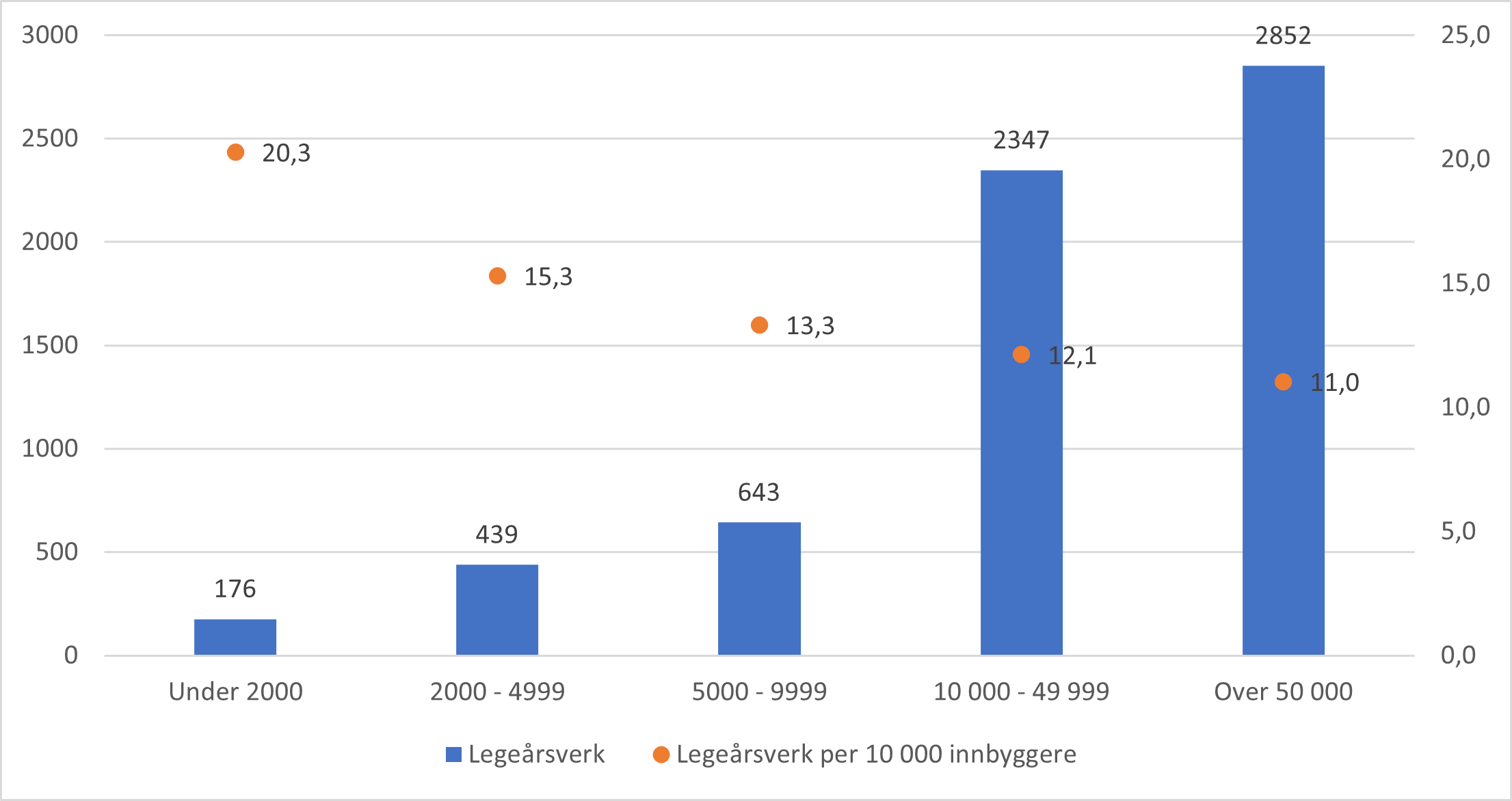 Figur 5.5 viser at små kommuner samlet sett har flere legeårsverk per innbygger enn befolkningsmessig store kommuner. Små kommuner må ofte ha flere årsverk for å få legevakt og deltakelse i annet allmennmedisinsk arbeid til å gå opp samtidig med å drive fastlegeordningen.