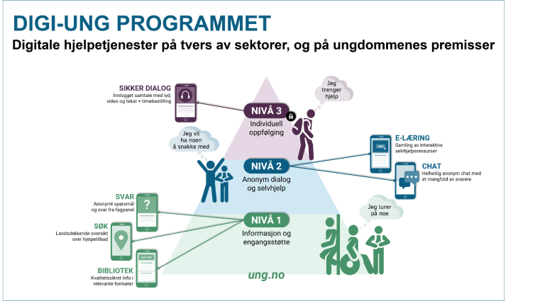 DIGI-UNG programmet har som formål å samle tilgjengelige digitale tjenester for ungdom på et sted og videreutvikle digitale hjelpetjenester på ungdommenes premisser. Dagens fragmenterte tilbud ønskes samordnet under en overordnet brukerflate som tilbyr tjenester på flere nivåer, på tvers av sektorer og som er koblet til relevante offentlige og frivillige aktører. Målgruppen er ungdom i alderen 13 til 20 år. Ungdommer skal ha flere muligheter å få informasjon, drive selvhjelp og motta hjelp på, i tråd med deres brukermønstre og gjennom sømløse brukerreiser.