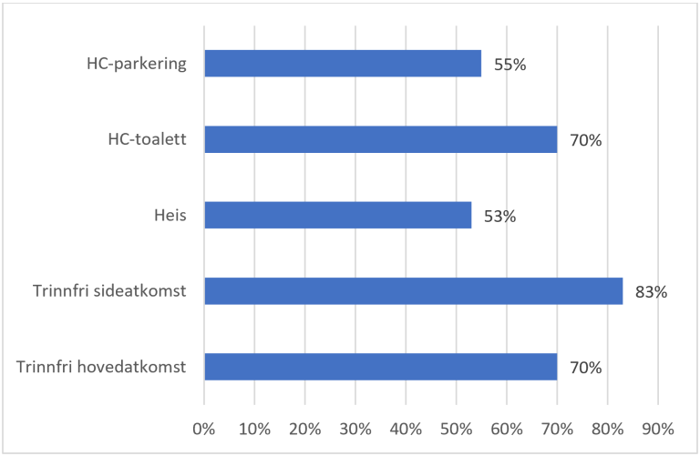 Per 2021 rapporterer Statsbygg at 7 av 10 av byggene de forvalter har trinnfri hovedadkomst, og at over 8 av 10 av byggene har trinnfri sideatkomst. Det er imidlertid viktig å bemerke at tallene ikke gjenspeiler den totale situasjonen for bygg som er forvaltet av Statsbygg ettersom enkelte bygg er utelatt fra grunnlaget, og at porteføljen endres.