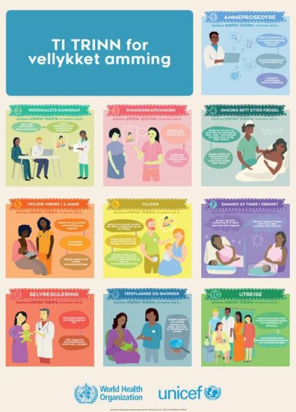 Ti trinn for vellykket amming – plakater for Mor-barn-vennlig sykehus