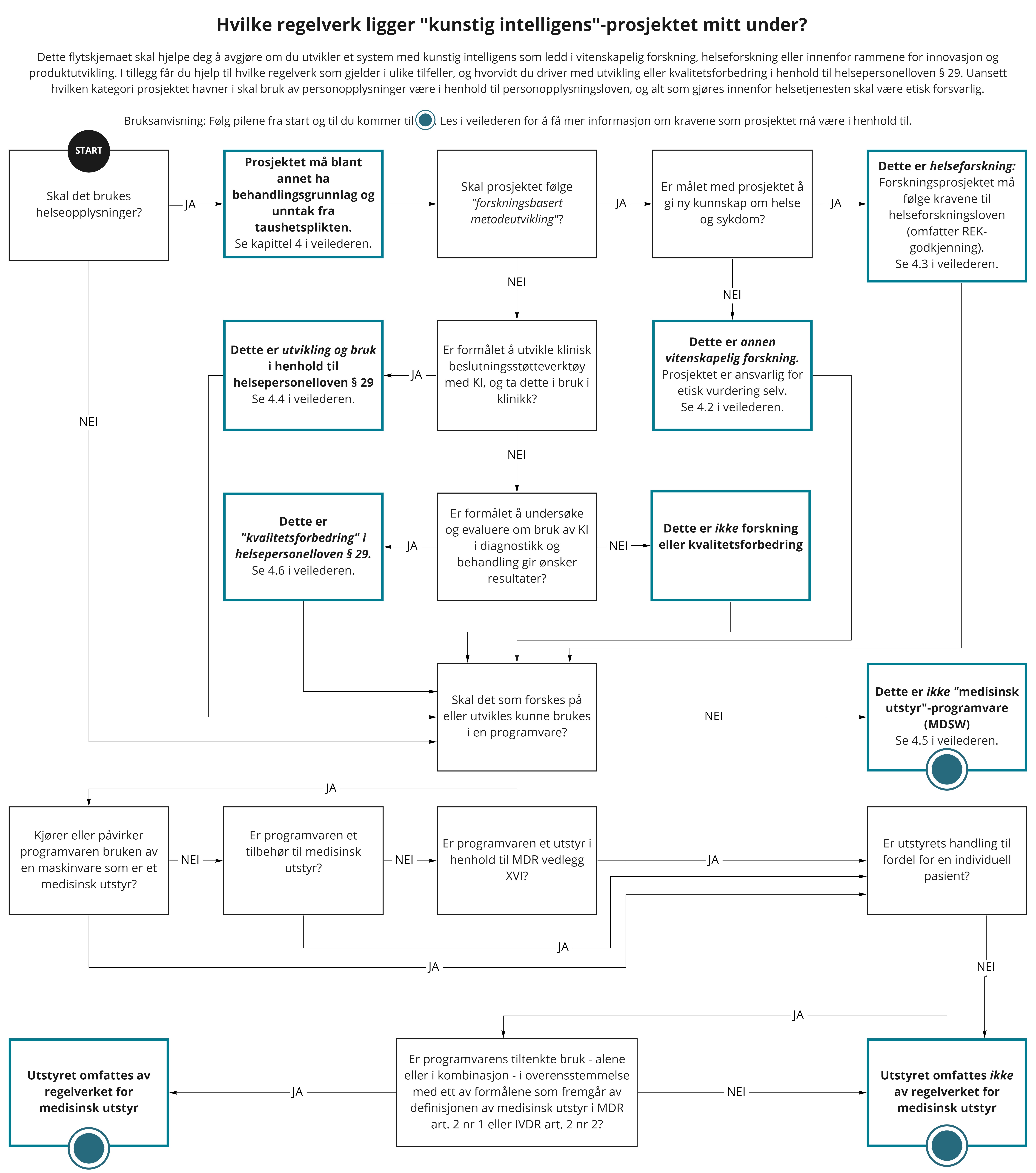 Flytdiagrammet refererer til ulike avsnitt i regelverket for utvikling av kunstig intelligens innenfor forskning (herunder helseforskning), utvikling og bruk av klinisk beslutningsstøtteverktøy og kvalitetsforbedring.
