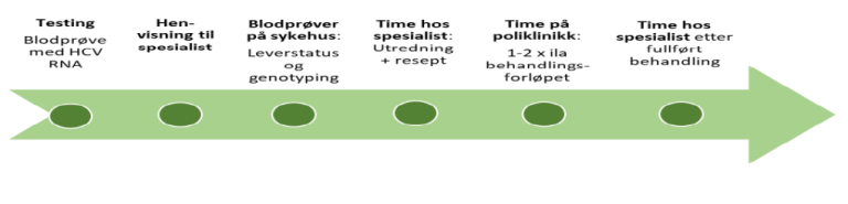 Pasienter som kan planlegge og følge opp avtaler, oppfordres til å oppsøke sin fastlege for å ta en blodprøve for hepatitt C. Dersom antistoffprøven er positiv, gjør laboratoriene rutinemessig en undersøkelse for HCV RNA. Dersom HCV RNA påvises, henvises pasienten til spesialisthelsetjenesten for videre oppfølging. Illustrasjonen under viser det tradisjonelle behandlingsforløpet.