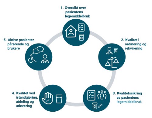 Her presenteres de sentrale trinnene i en god praksis for riktig legemiddelbruk med egne gjennomføringsområder.