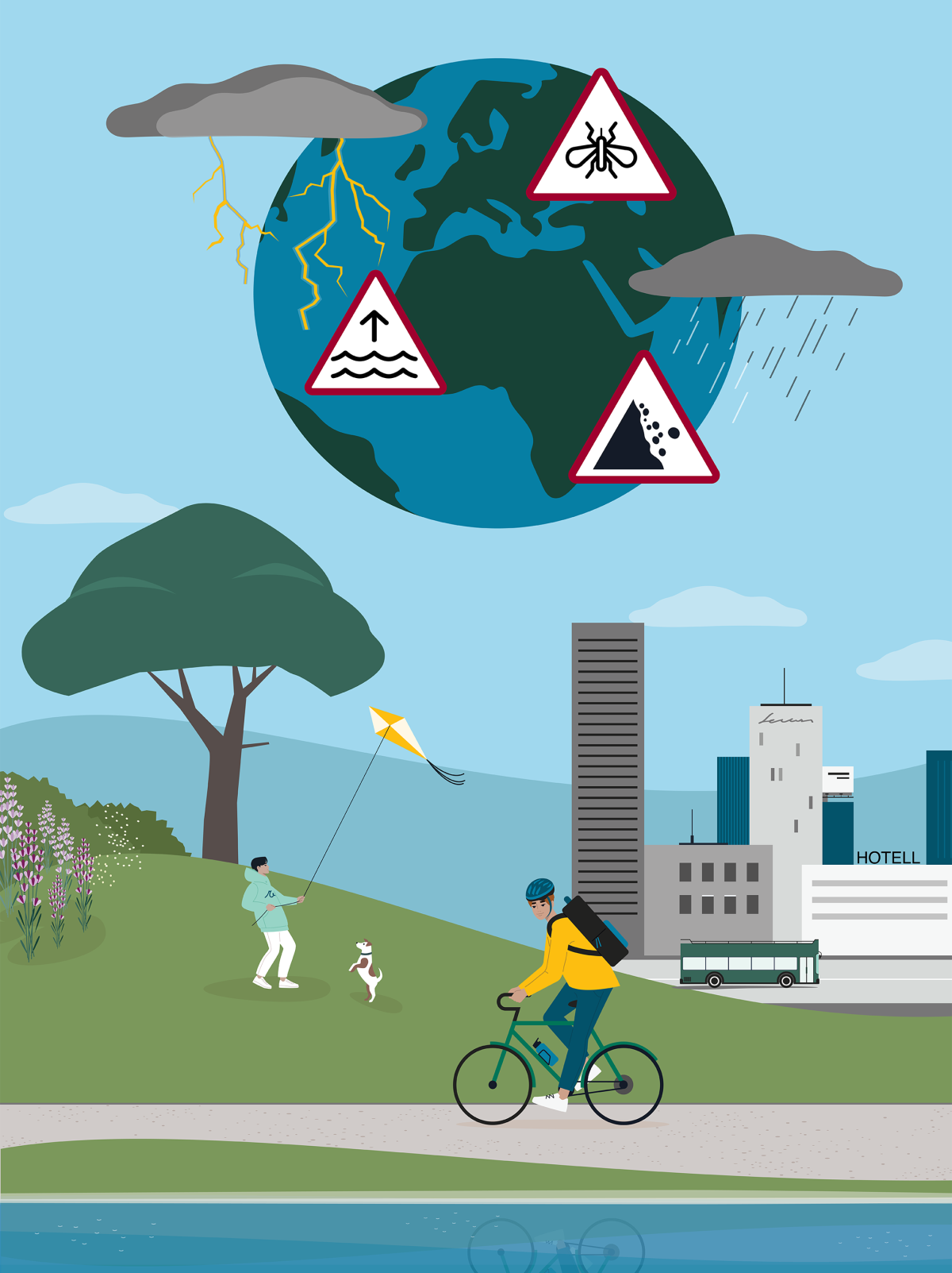 Det vil variere hvilke værhendelser og klimaendringer ulike deler av landet er mest utsatt for, og særlig er det forskjeller mellom innlands- og kystkommuner. Utfordringene i Norge vil hovedsakelig være knyttet til høyere temperatur, mer kraftig nedbør, mer overvann, flere og større regnflommer og økt fare for jord-, flom- og sørpeskred. I tillegg vil en økning i havnivå føre til høye vannstander og at bølger strekker seg høyere opp og lengre inn på land (4). Ekstreme og akutte værhendelser kan føre til skade og sykdom både fysisk og psykisk, i tillegg til skade på infrastruktur, eiendom og bygg (5).