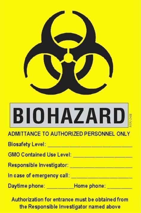 Alle laboratorier og anlegg for innesluttet bruk av genmodifiserte mikroorganismer på nivå 2 og høyere, samt all bruk av genmodifiserte planter, skal merkes med biologisk fareskilt og hvilke organismer som brukes.
