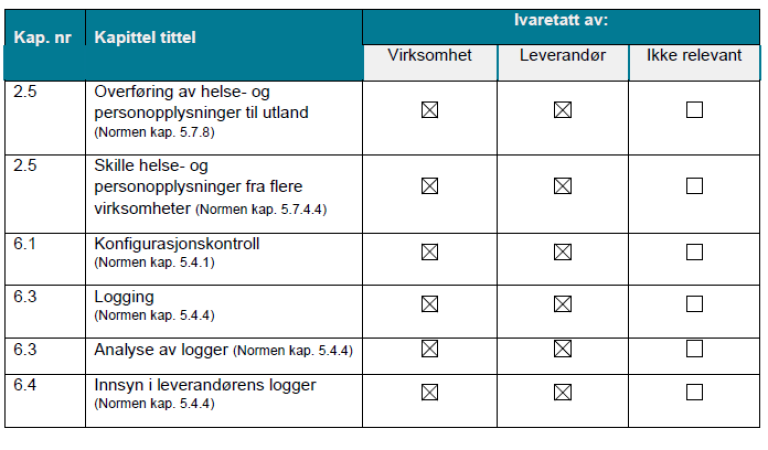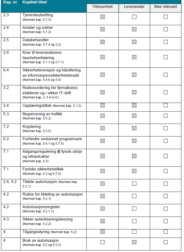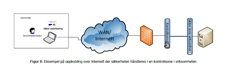 - Virksomheten har en kontrollsone som innehar nødvendige sikkerhetsmekanismer, og forhindrer direkte kommunikasjon fra leverandørens brukerutstyr til foretakets systemer. F.eks. VDI/TS.