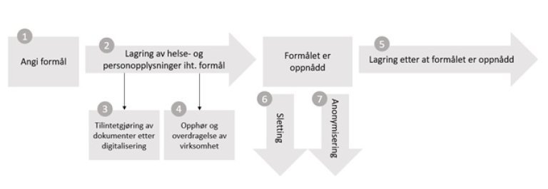 Normen stiller krav om at virksomheten oppbevarer helse- og personopplysninger så lenge det er nødvendig for å oppnå formålene med behandlingen av opplysningene. Med mindre opplysningene deretter skal oppbevares i henhold til nye og legitime formål, skal opplysningene slettes eller anonymiseres. Dette faktaarket gir en oversikt over, og beskrivelse av, kravene om lagringstid og sletting av helse- og personopplysninger. Krav til lagringstid og sletting finnes både i særlovgivningen for helse- og omsorgssektoren og i den generelle personvernforordningen. I tillegg har arkivlovgivningens regler (arkivlova, arkivforskriften og riksarkivarens forskrift) betydning for lagringstid og sletting av helse og personopplysninger.
