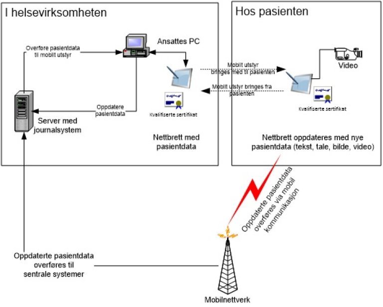 Eksempelet under illustrerer bruk av mobilt utstyr i en hjemmetjeneste hvor det lagres helse- og personopplysninger som bringes med hjem til pasienten/bruker. Illustrasjonen er ment å gi innspill på områder som må fokuseres på i en risikovurdering. Viktige områder som må vurderes er bl.a. overføring av helse- og personopplysninger via plugg i veggen eller mobil kommunikasjon, data på lokalt utstyr (ansattes PC), mellomlagring av data på mobilt utstyr og oppdatering av sentralt lagrede helse- og personopplysninger.