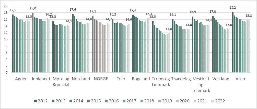 Det er noe variasjon mellom fylkene i rekvirering av NSAIDs. I 2022 var andelen eldre med minst én resept på NSAIDs høyest i Rogaland med 16,3 prosent. Troms og Finnmark lå lavest med 11,8 prosent.
