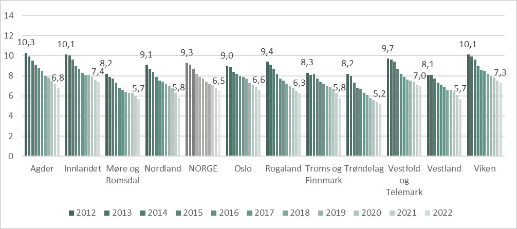 I 2022 fikk nær 51 000 personer i alderen 65 år og eldre utlevert mer enn 365 definerte døgndoser (DDD) vanedannende legemidler på apotek etter resept fra allmennlege. Dette tilsvarer 4,8 prosent av den eldre befolkningen i Norge. Andelen eldre med mye vanedannende legemidler fra allmennlege har gått gradvis ned over tid nasjonalt (figur 10.1).