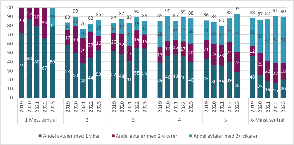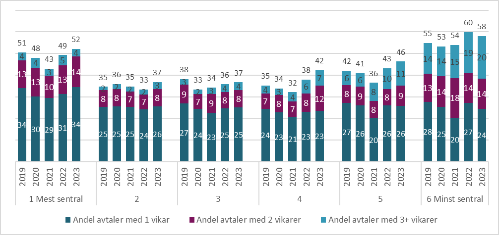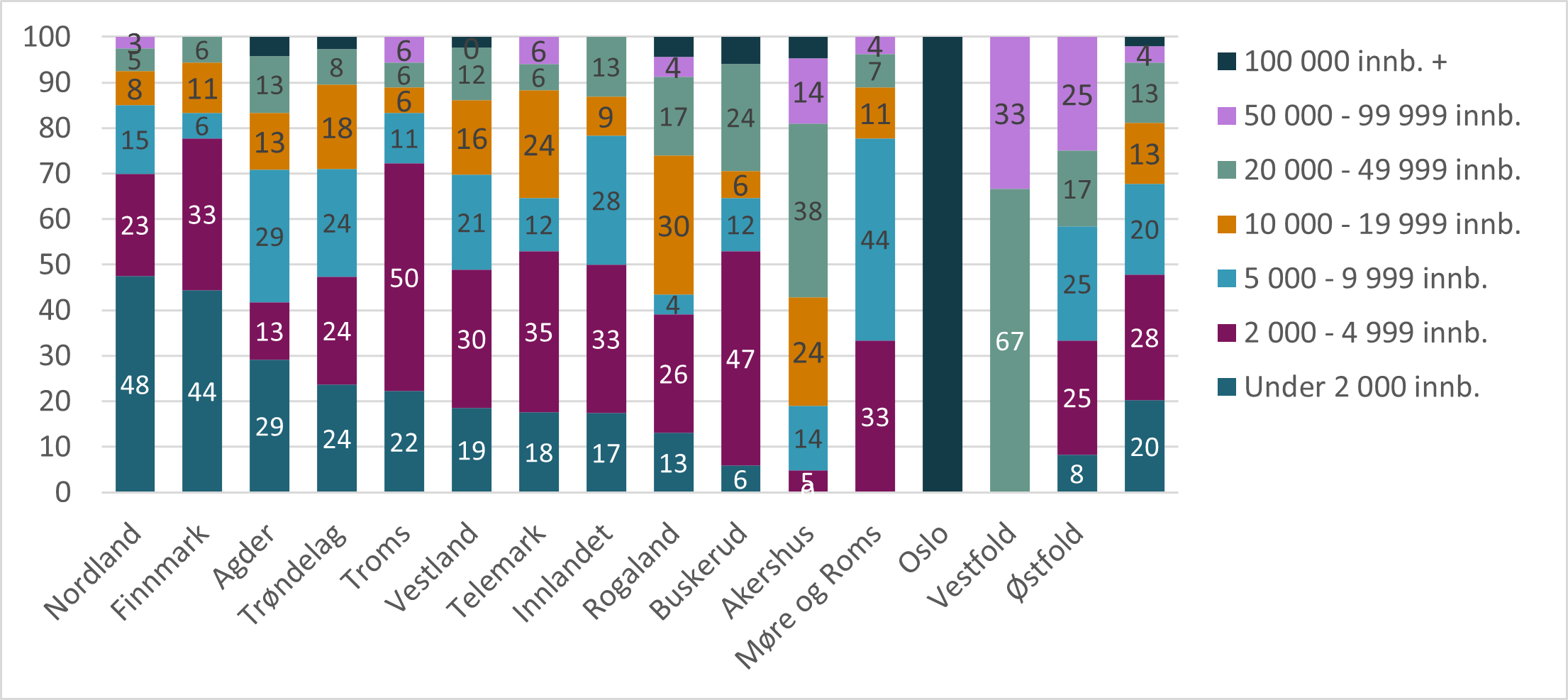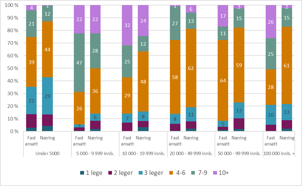 Figur V8.1.Fordeling av kommuner etter sentralitetsklasse 5 og 6 etter fylke. Per 2024. Prosent. Kilde: FLOFigur V8.2. Fordeling av kommuner etter kommunestørrelse per fylke 2024. Prosent. Kilde: FLOFigur V8.3. Antall innbyggere på venteliste per 1000 listeinnbygger etter sentralitet 4. kvartal 2019 og 1. kvartal 2024. Kilde: FLOFigur V8.4. Andel fastleger som har hatt vikar siste år fordelt etter sentralitet og antall vikarer. 2019 - til 2023. Kilde: FLOFigur V8.5. Andel lister uten fast lege som har hatt vikar siste år fordelt etter antall vikarer på listen. 2019 til 2023. Kilde: FLOFigur V8.6. Antall legekontor etter størrrelse (leger/lister). Per mars 2024. Kilde: FLOFigur V8.7. Andel av fast ansatte og av næringsdrivende leger fordelt etter størrelsen på legekontoret. Per mars 2024.Kilde: FLO