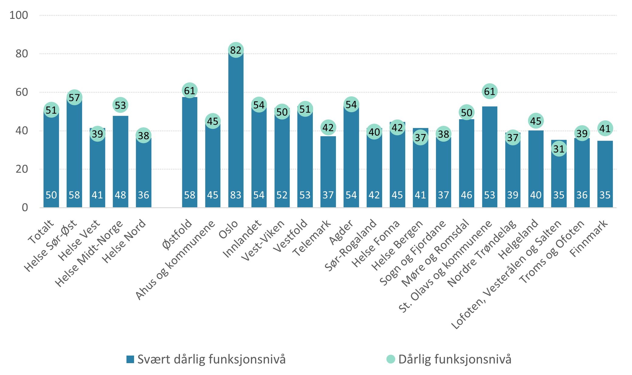 [19] På grunn av at lave andeler av de noe redusert eller redusert funksjonsnivå var på langtidsopphold i institusjon vises kun resultater for de med dårlig eller svært dårlig funksjonsnivå i figuren inndelt etter helsefellesskap.
