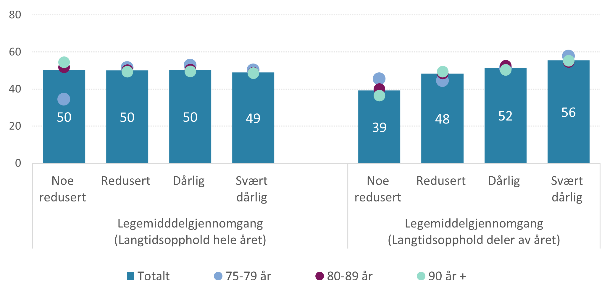Om lag halvparten av de som var på langtidsopphold hele 2021 hadde en registrert legemiddelgjennomgang i 2021. Dette gjaldt uavhengig av funksjonsnivå. Blant de som var på langtidsopphold deler av 2021 varierte andelen med legemiddelgjennomgang fra 39 prosent blant de med noe redusert funksjonsnivå til 56 prosent blant de med svært dårlig funksjonsnivå.