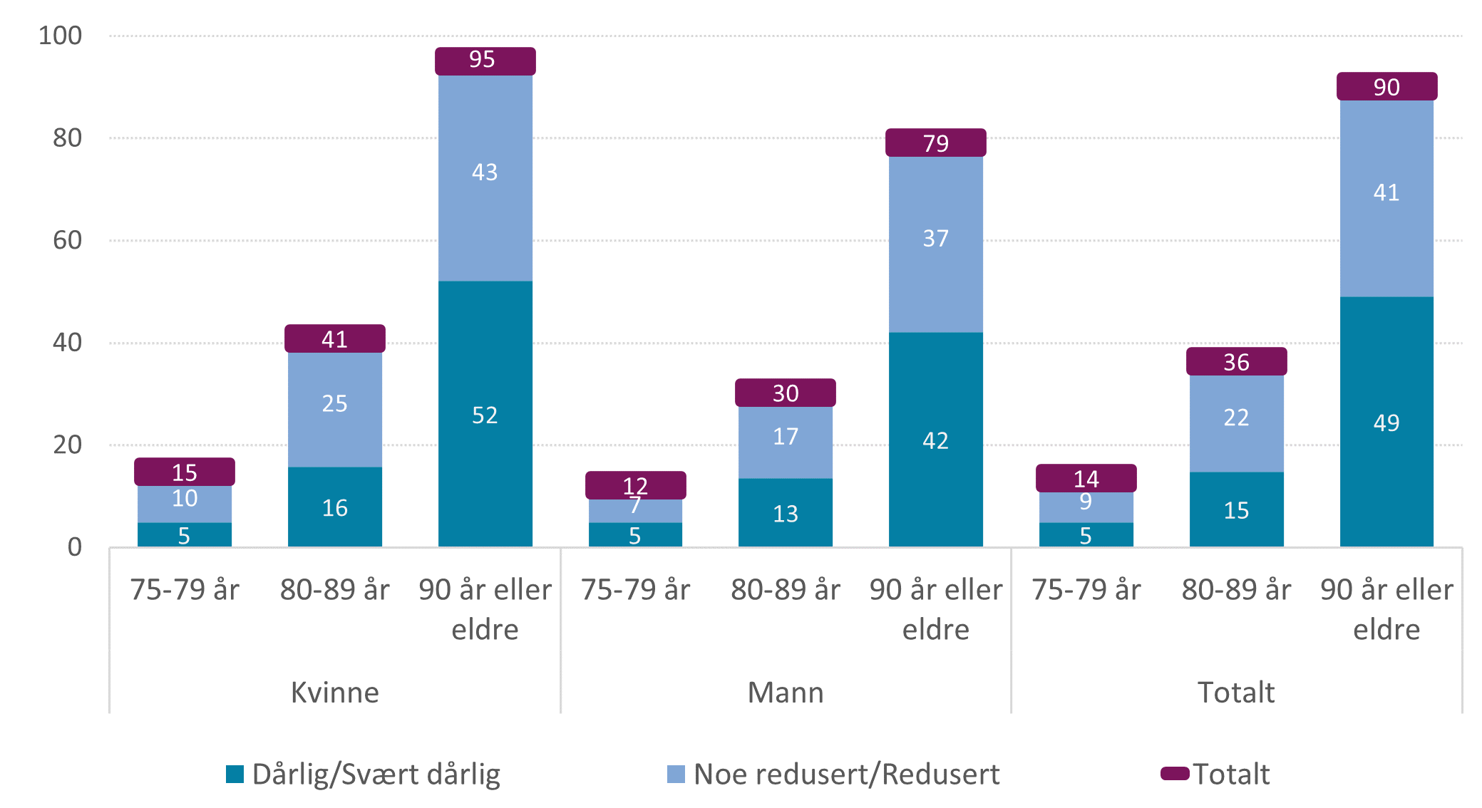 Figur 1 viser at det naturlig nok var store variasjoner mellom aldersgruppene når det gjelder andelene med dårlig eller redusert funksjonsnivå. Blant de eldste hadde nesten halvparten dårlig eller svært dårlig funksjonsnivå, mens dette gjaldt fem prosent av de i alderen 75-79 år. Andelen med dårlig eller svært dårlig funksjonsnivå var høyere blant kvinner enn menn av de som var 80 år og eldre.
