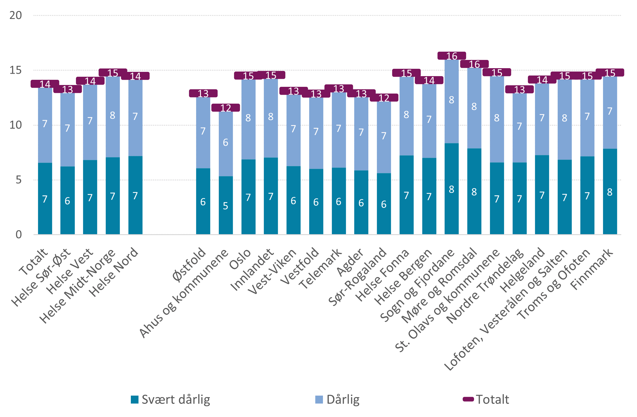 Figur 2 viser andel av befolkningen i ulike regioner og helsefellesskap med dårlig eller svært dårlig funksjonsnivå. Blant de ulike regionene varierte andelen fra 13 prosent i Helse Sør-Øst til 15 prosent i Helse Midt-Norge. Av helsefellesskapene var det Ahus og kommunene som hadde lavest nivå (12 prosent), mens Sogn og Fjordane hadde høyest nivå (16 prosent). Det var større variasjoner mellom helsefellesskapene når vi ser på andelen med svært dårlig enn dårlig funksjonsnivå.