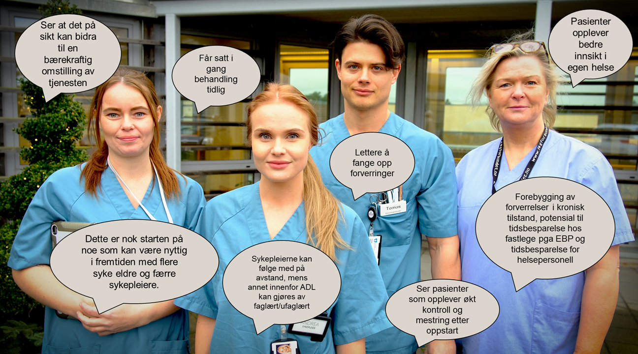 Mange opplever også at de kan gi en tettere og mer målrettet oppfølging av pasienter og at de når ut til brukergrupper man ikke har nådd på samme måte tidligere. Sykepleiere i hjemmetjenesten i Larvik, som har benyttet digital hjemmeoppfølging som oppfølging av sine pasienter og pårørende, opplevde dette veldig nyttig (figur 9).