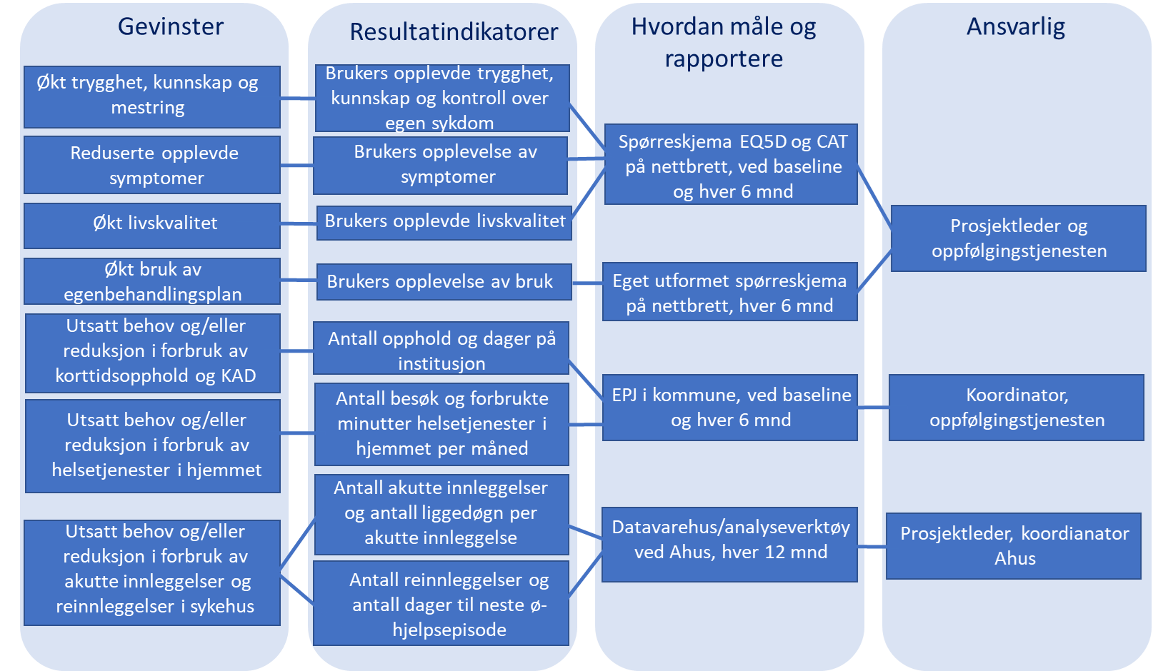 Prosjektene har utarbeidet mål tilpasset til lokale satsinger og målgrupper. Alle prosjektene har utarbeidet gevinstplaner med oversikt over hva de ønsker å oppnå med digital hjemmeoppfølging og hvordan de skal følge opp dette. Under ligger eksempel fra prosjektet i Ullensaker som viser både gevinster og resultatindikatorer, og hvordan dette skal måles og rapporteres, i tillegg til hvem som er ansvarlig (Figur 8).