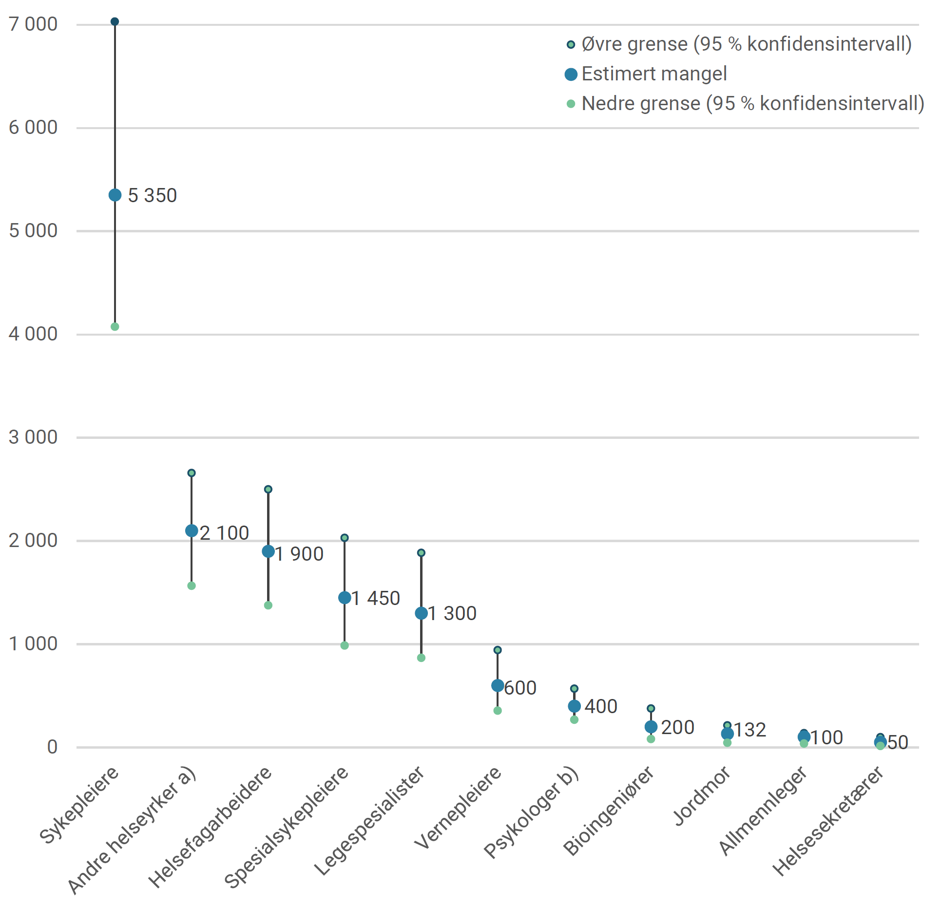 Kilde: NAVs bedriftsundersøkelse 2021. Estimatene er stort sett rundet av til nærmeste 50 (unntaket er jordmødre). Den reelle mangelen er med 95 prosent sannsynlighet langs de vertikale linjene. a) Gruppen "andre helseyrker" omfatter helsepersonell som ikke er klassifisert som en av de andre yrkesgruppene i standard for yrkesklassifisering (STYRK-08), som NAV benytter i undersøkelsen. b) Merk at NAV benytter en bred definisjon av psykologer, og at vi ikke vet hvor stor del av mangelen som gjelder psykologer slik Helsedirektoratet definerer det (kliniske psykologer), men figur 14 under viser at det meste av den observerte mangelen er i spesialisthelsetjenesten. I tillegg til yrkesgruppene som er vist i figuren, estimeres det en mangel på 50 ledere av eldreomsorg og 100 ledere av helsetjenester. Det har i liten grad vært mangel på bioingeniører og helsesekretærer tidligere år, og disse har ikke egne figurer i notatet.