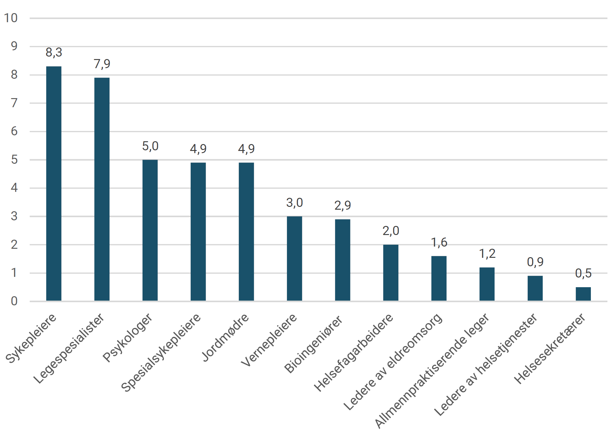Kilde: NAVs bedriftsundersøkelse 2021. Stramhetsindikatoren angir forholdstallet mellom mangelen på arbeidskraft og ønsket sysselsetting (ønsket sysselsetting er den faktiske sysselsettingen pluss mangelen). Det er ikke beregnet stramhet for den løst definerte kategorien "andre helseyrker".