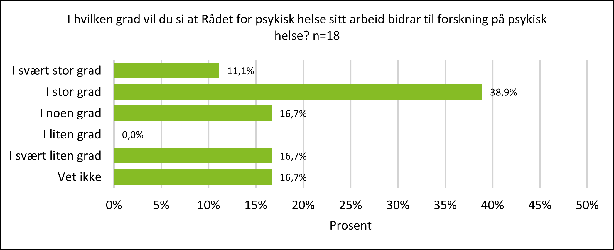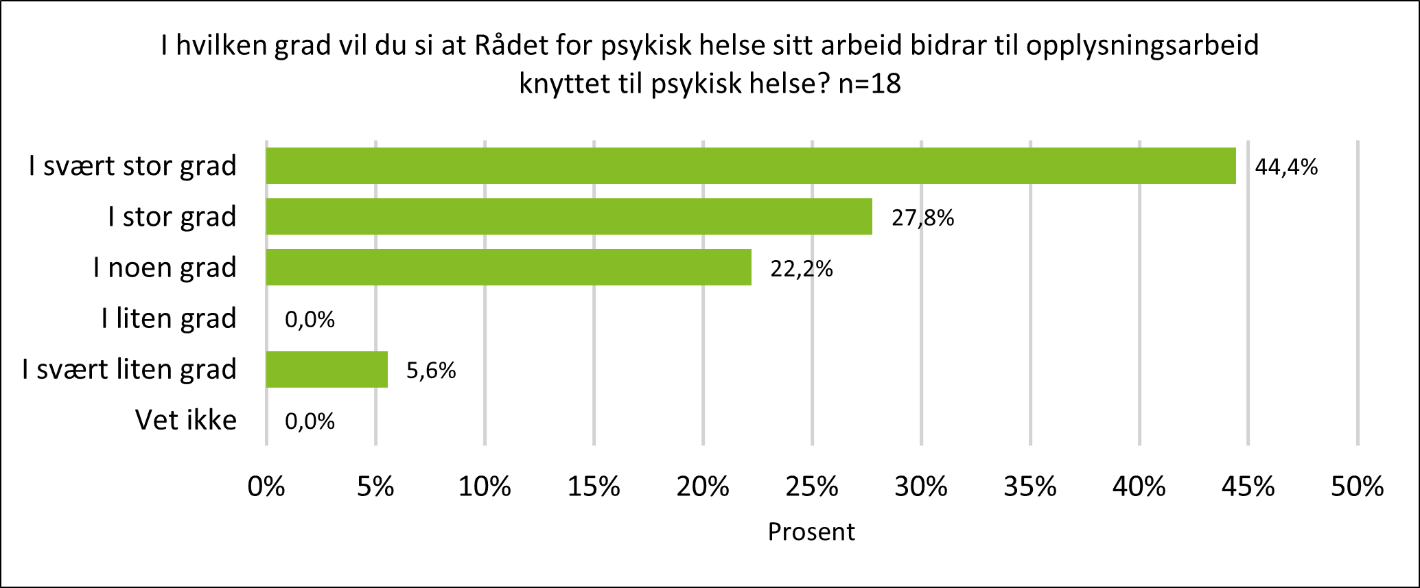 Det er stor variasjon i medlemsorganisasjonenes oppfatning av i hvilken grad Rådet for psykisk helse bidrar til de ulike formålene. En forholdsvis høy andel av medlemsorganisasjonene svarer «i svært stor grad» og «i stor grad» på tvers av de ulike formålene. Mest fornøyd er medlemsorganisasjonene med arbeidet som gjøres med opplysningsarbeid knyttet til psykisk helse, hvor over 70 % av respondentene svarer at Rådet for psykisk helse i stor eller svært stor grad bidrar til dette. For alle målene er det imidlertid også gjennomgående en viss andel av respondentene som svarer at Rådet for psykisk helse i liten eller svært liten grad bidrar til disse. Det er i størst grad medlemsorganisasjonene i kategoriene «profesjonsorganisasjon og fagforbund» og «bruker- og pårørendeorganisasjon» som svarer at rådets arbeid i liten grad eller i svært liten grad bidrar til de ulike målene. I en fritekstkommentar peker en av respondentene på at organisasjonen ikke fungerer etter formålet.