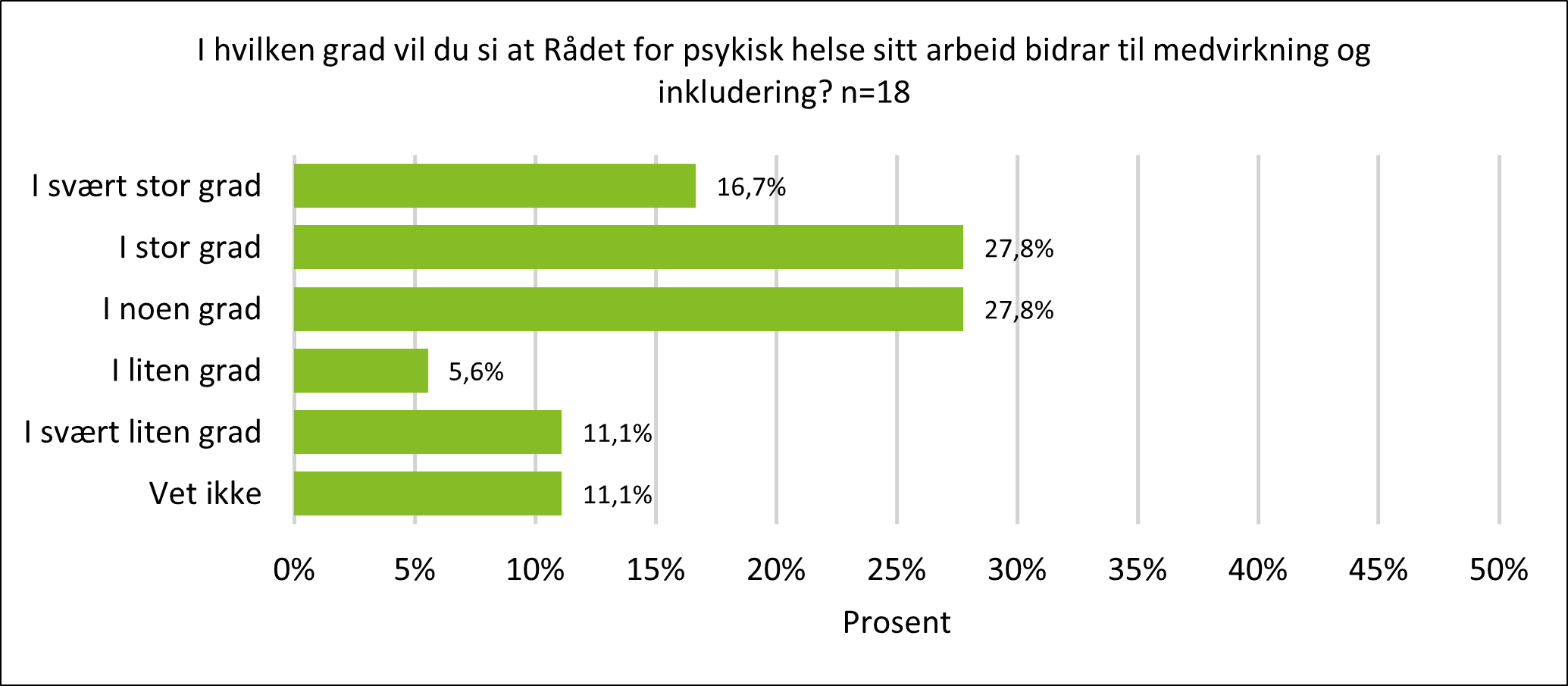 Som det fremgår av Figur 5 opplever et flertall av medlemsorganisasjonene at Rådet for psykisk helse fungerer som en pådriver for god psykisk helse. Om lag 33 % av medlemsorganisasjonene opplever imidlertid at Rådet bare i noen eller liten grad fungerer som dette.