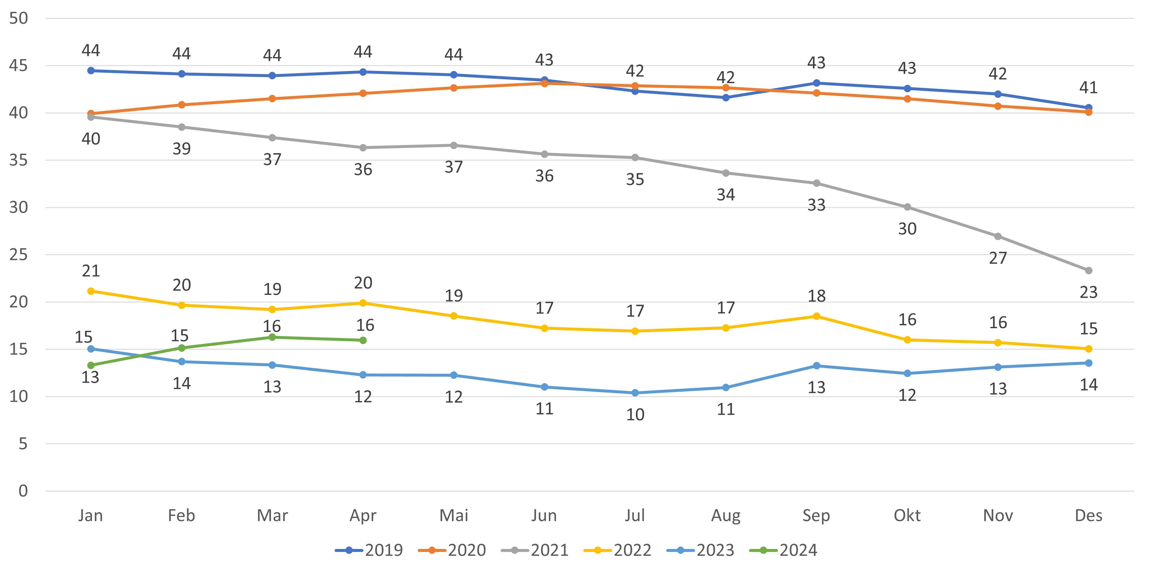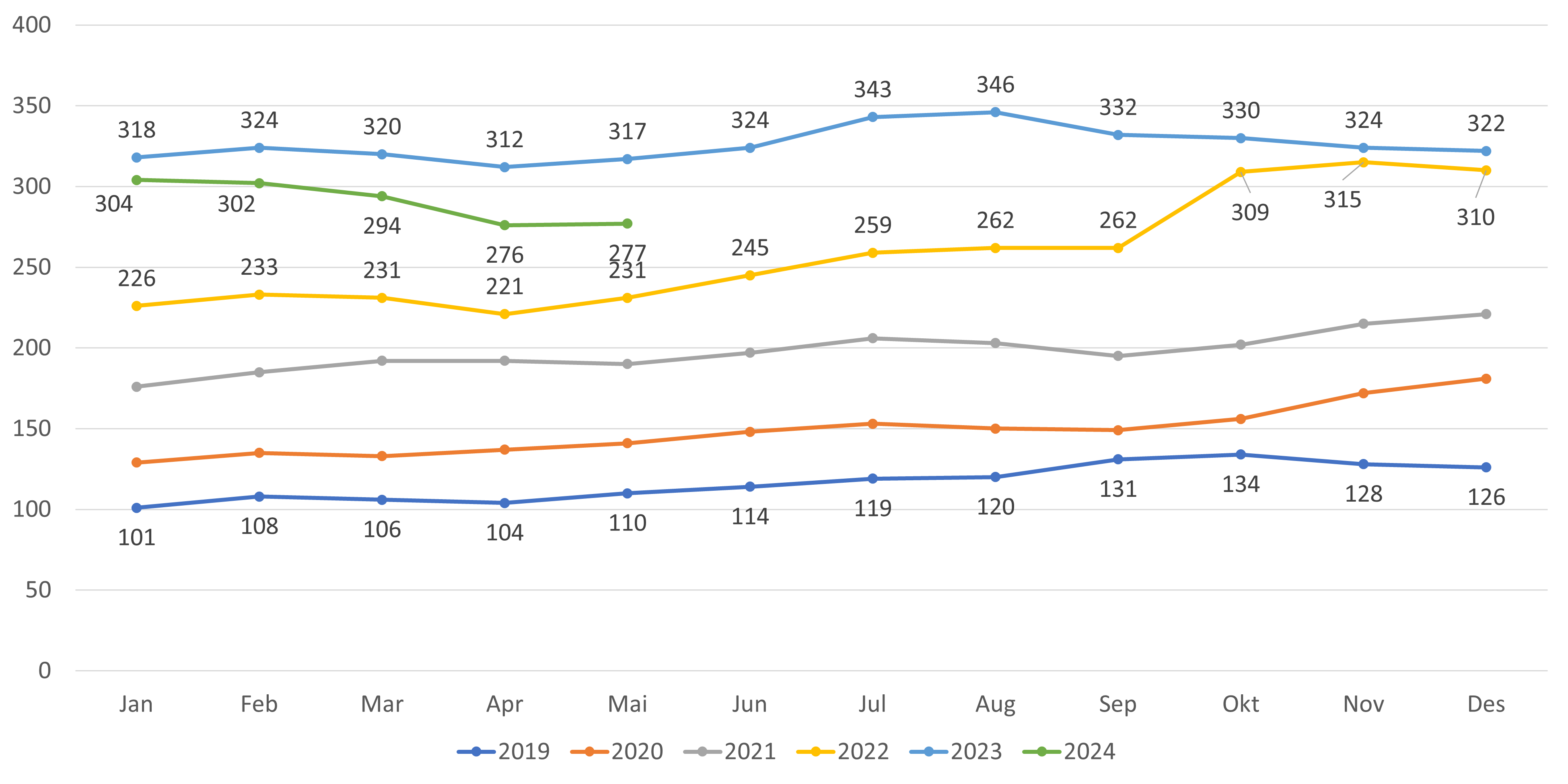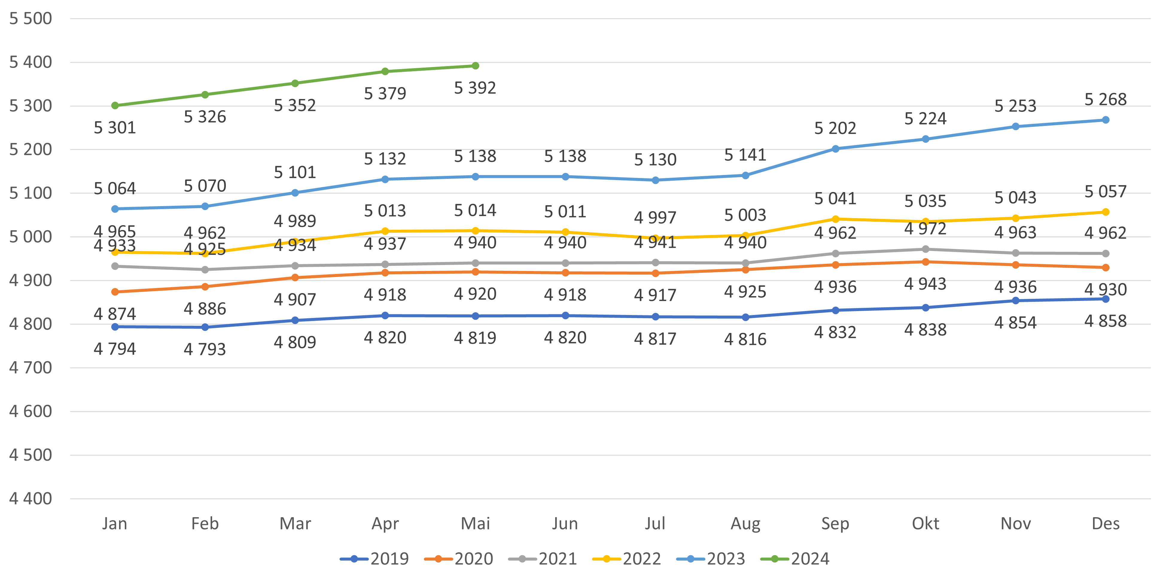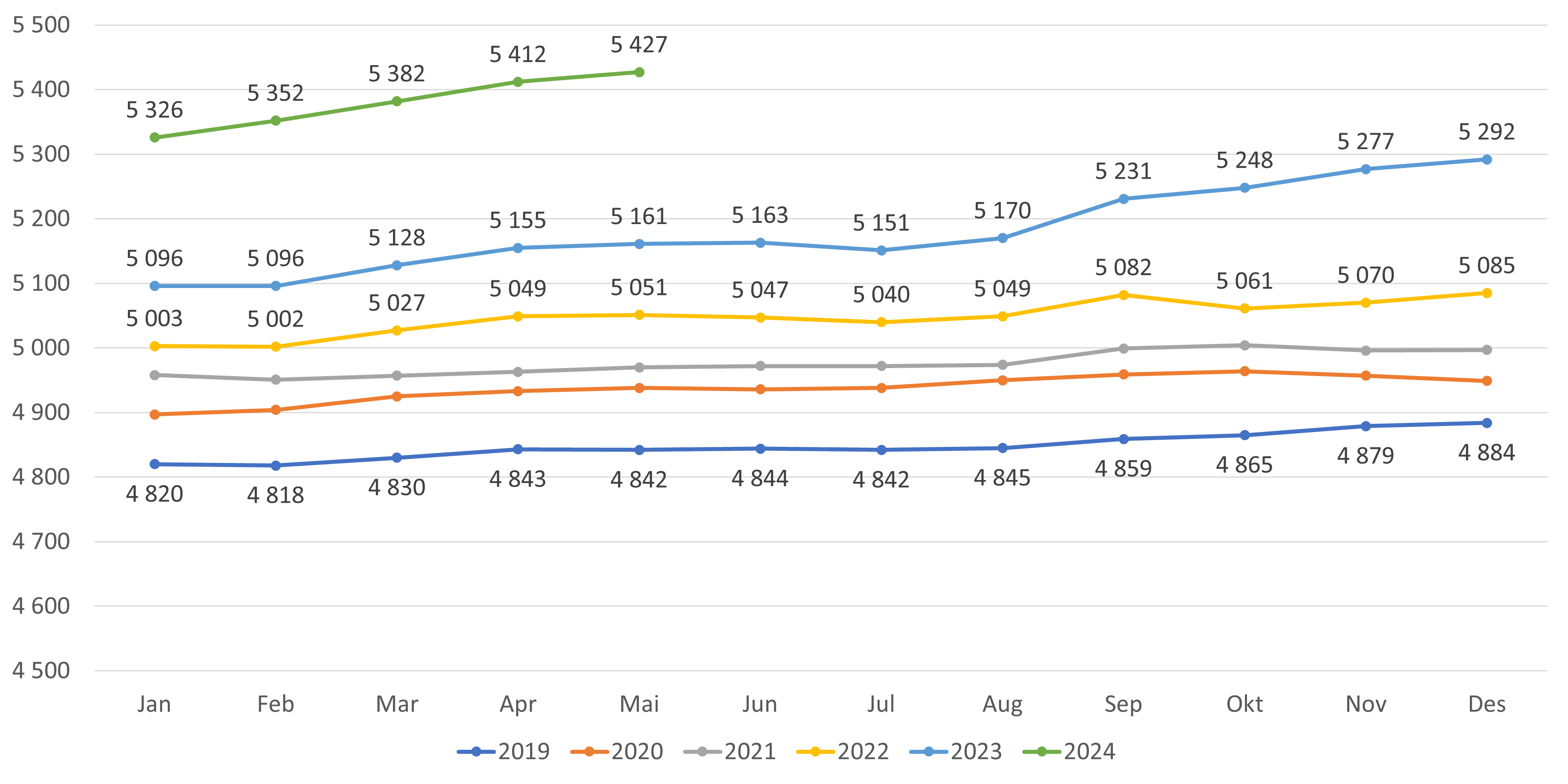 - Antall fastleger (personer) per mai 2024 er 5 392 fastleger. Dette er en økning på 13 fra april (figur 1). Hittil i 2024 (desember-mai) har antall fastleger økt med 124 leger, en økning som fortsatt er høyere sammenlignet med tilsvarende periode i fjor.