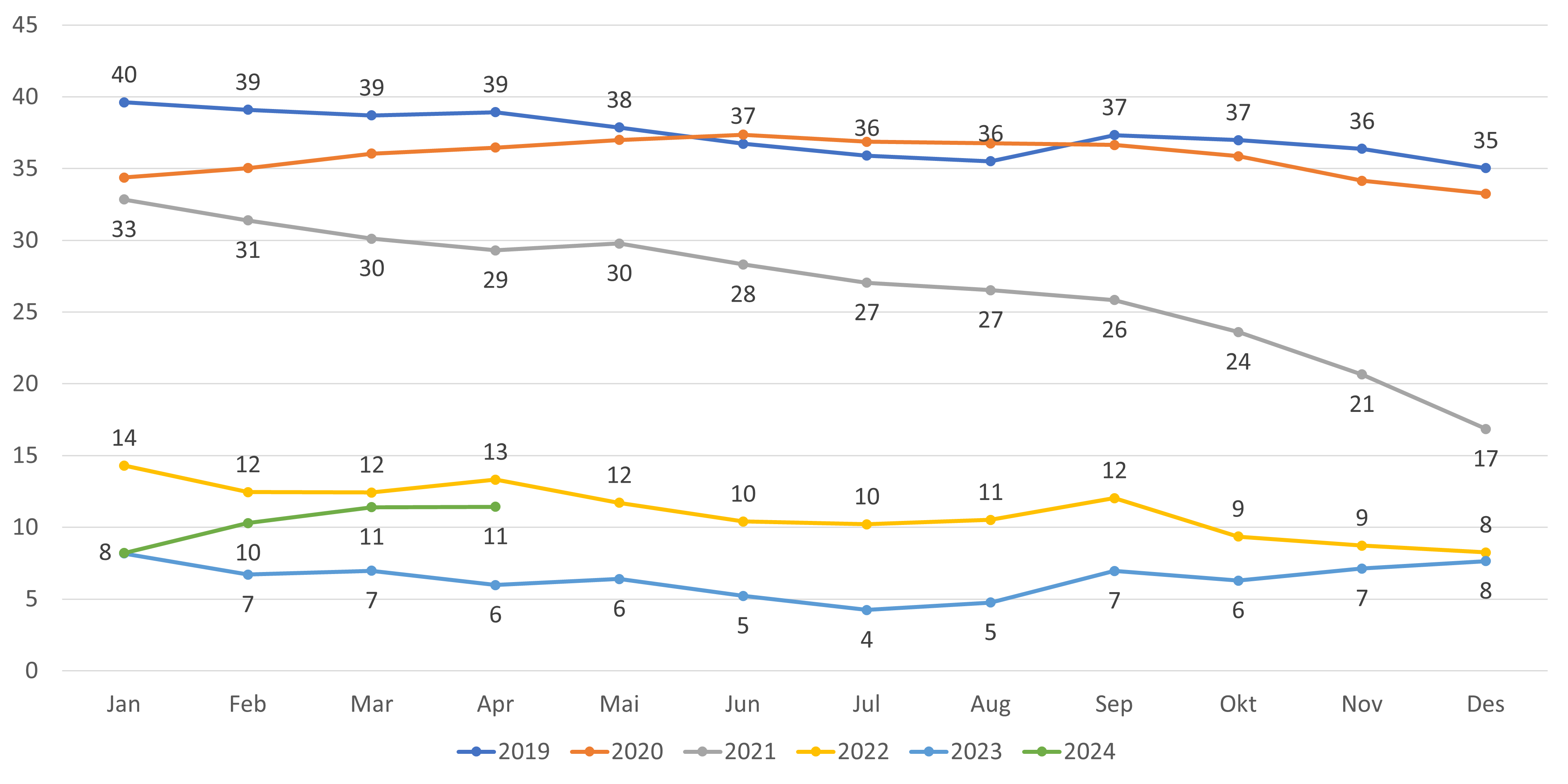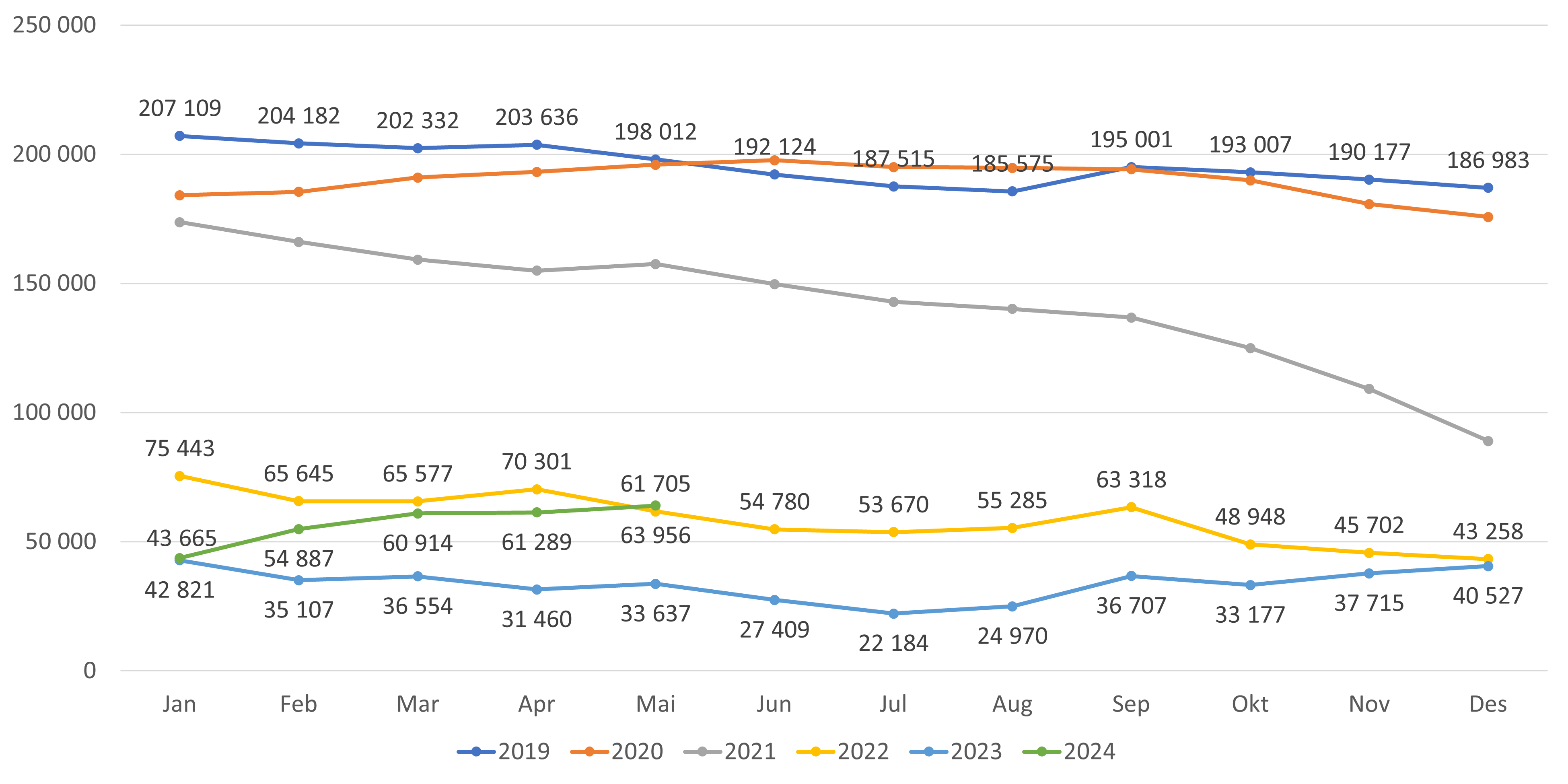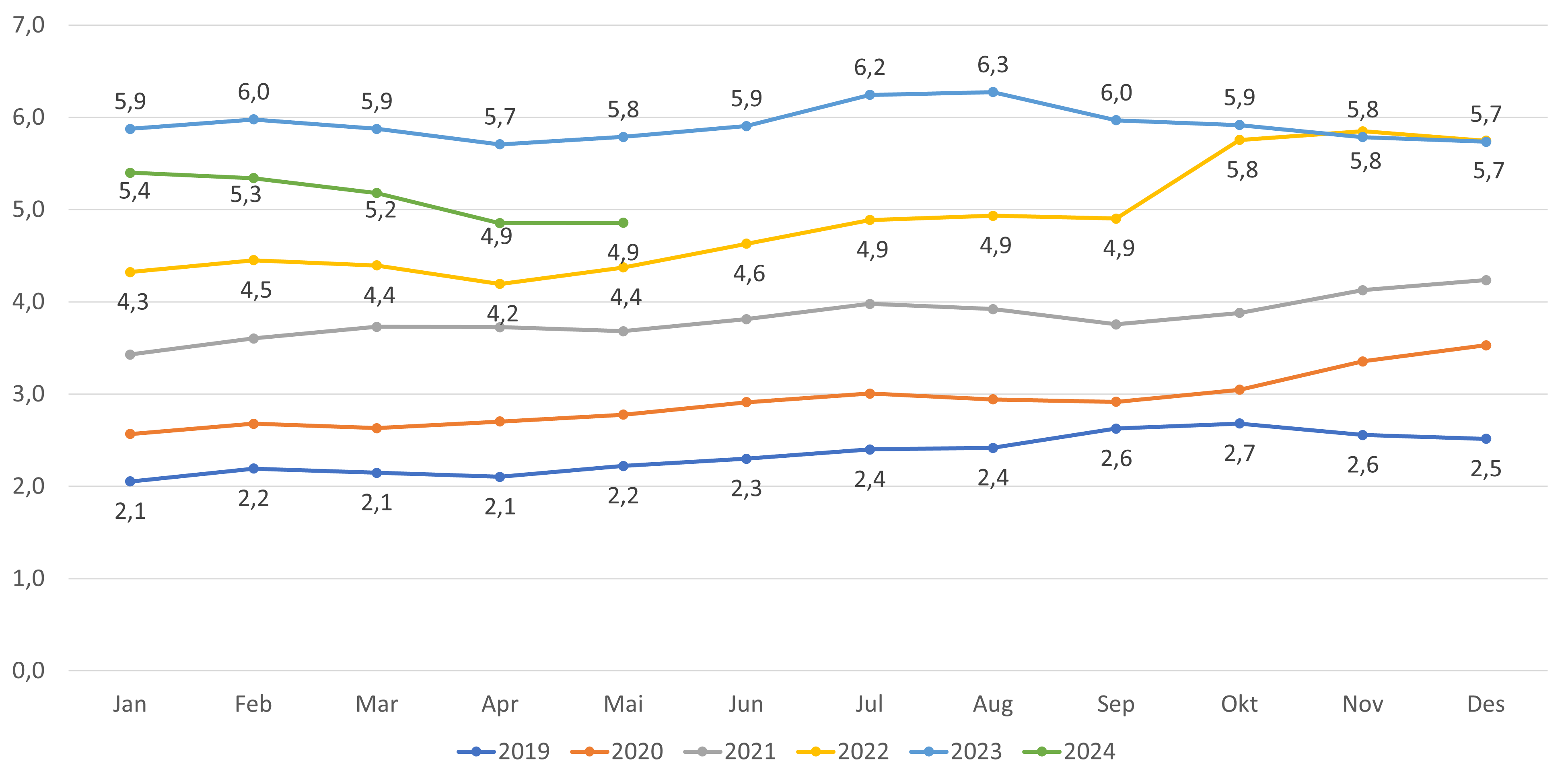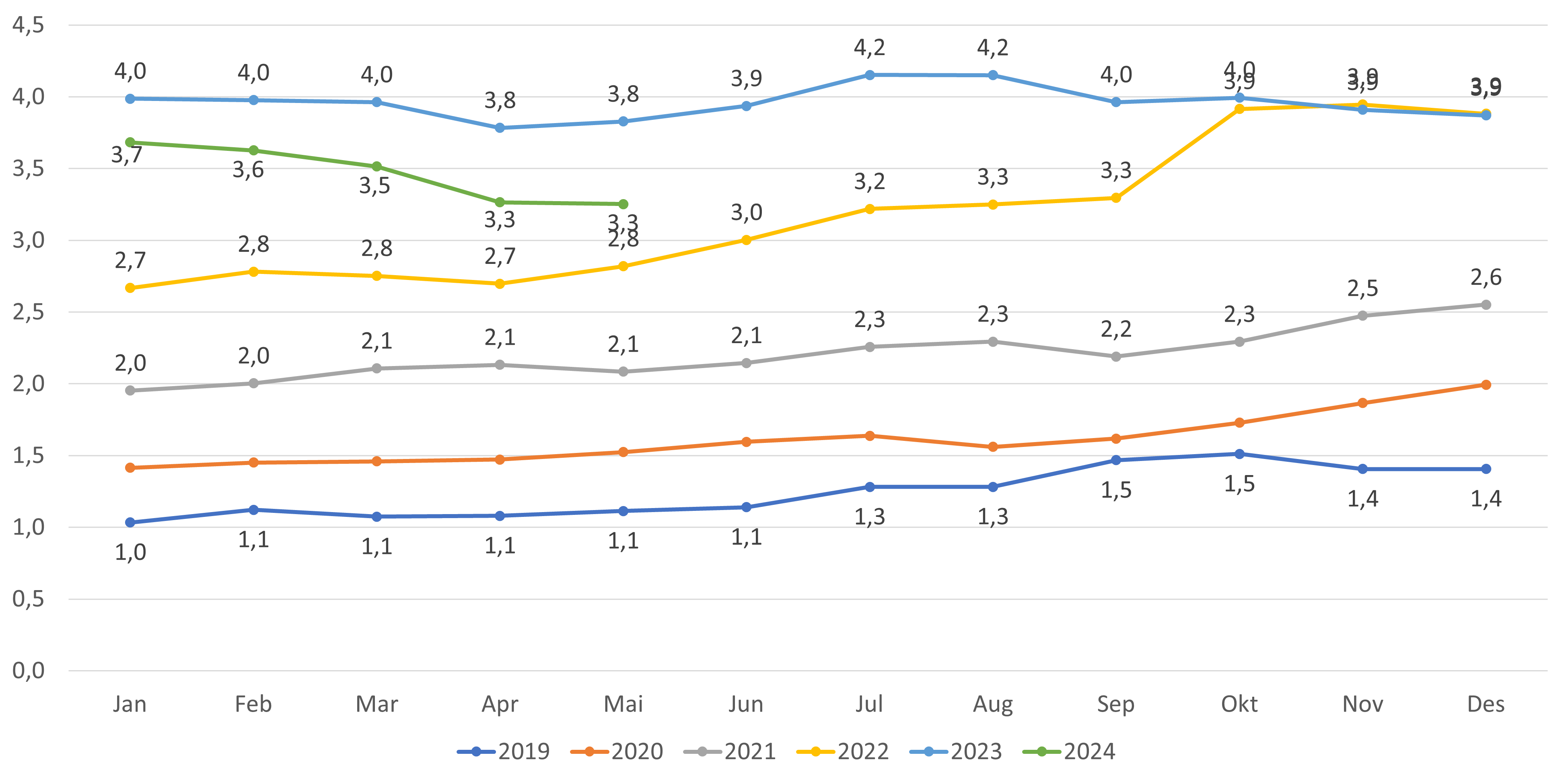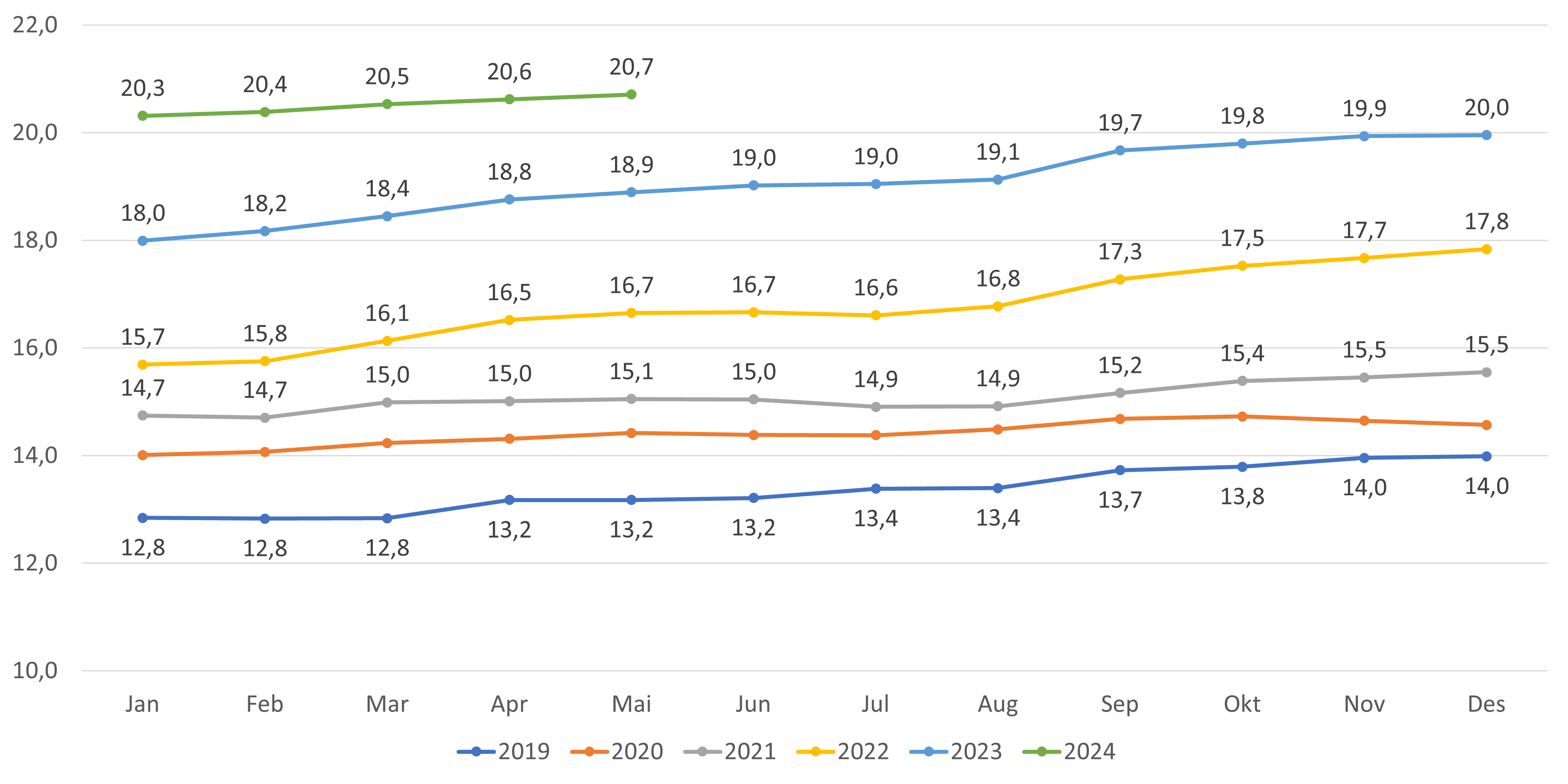 - Antall fastleger (personer) per mai 2024 er 5 392 fastleger. Dette er en økning på 13 fra april (figur 1). Hittil i 2024 (desember-mai) har antall fastleger økt med 124 leger, en økning som fortsatt er høyere sammenlignet med tilsvarende periode i fjor.