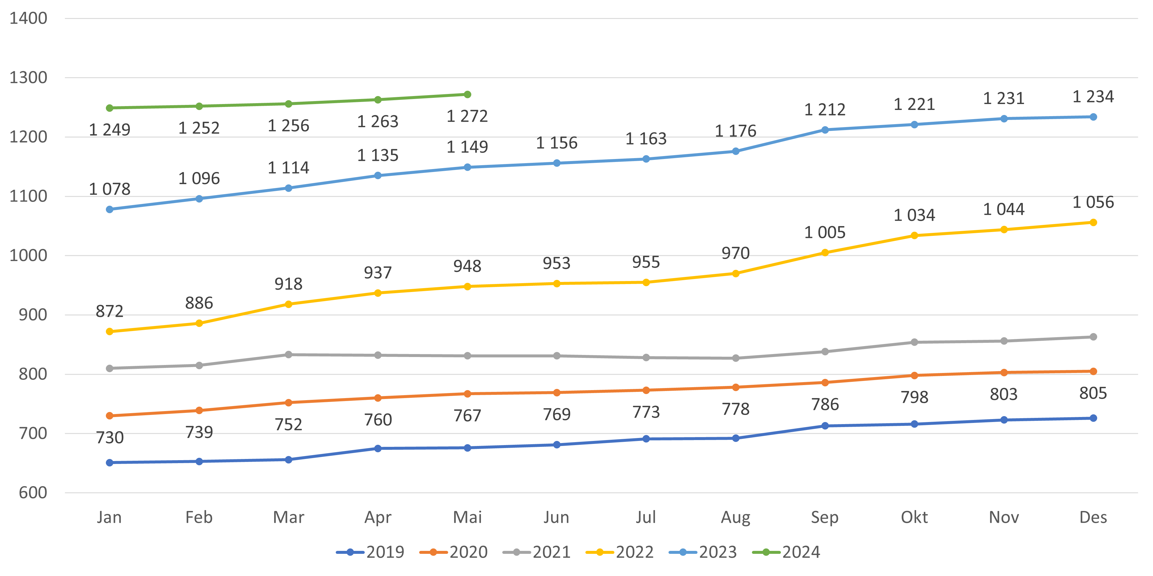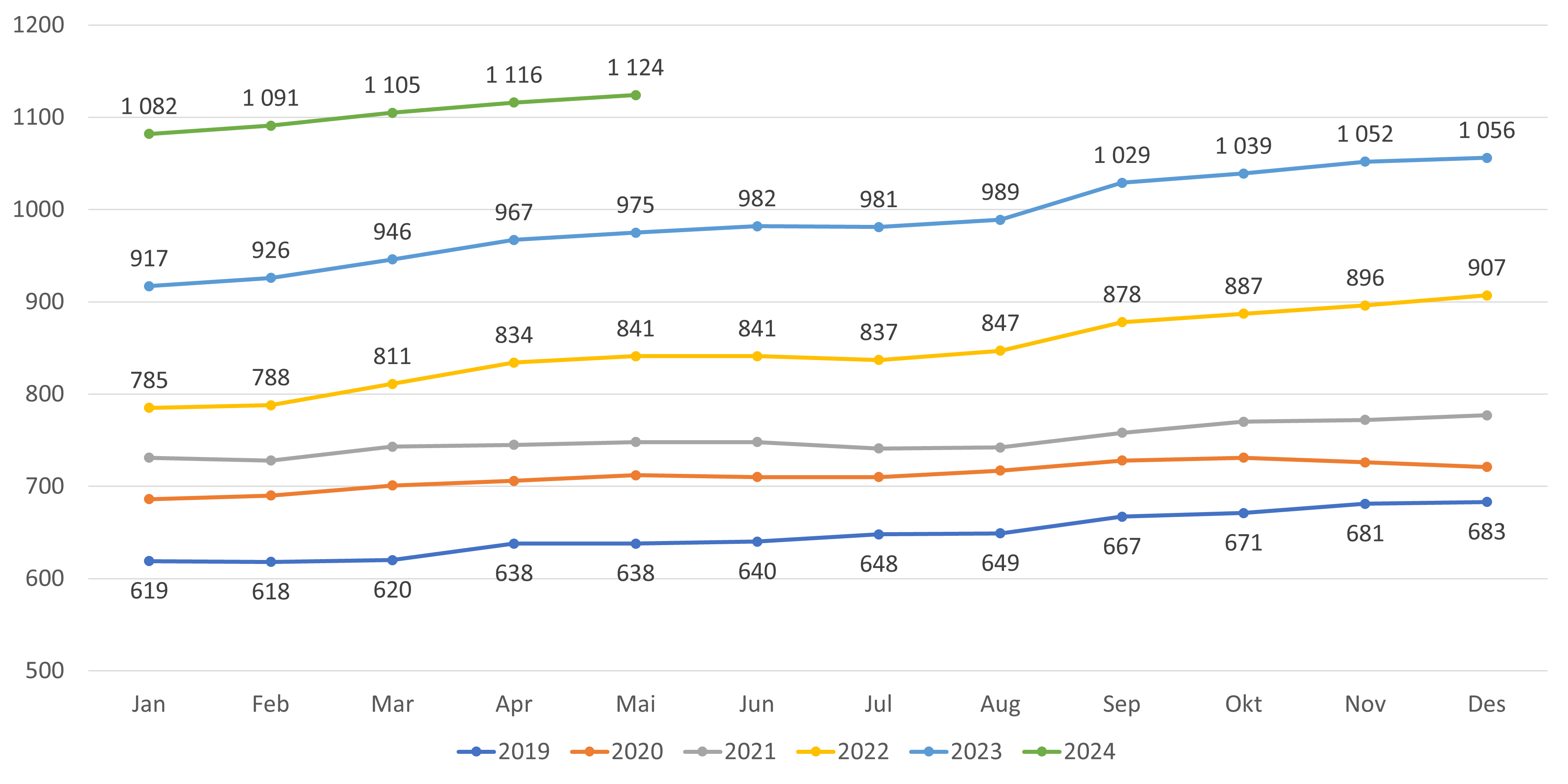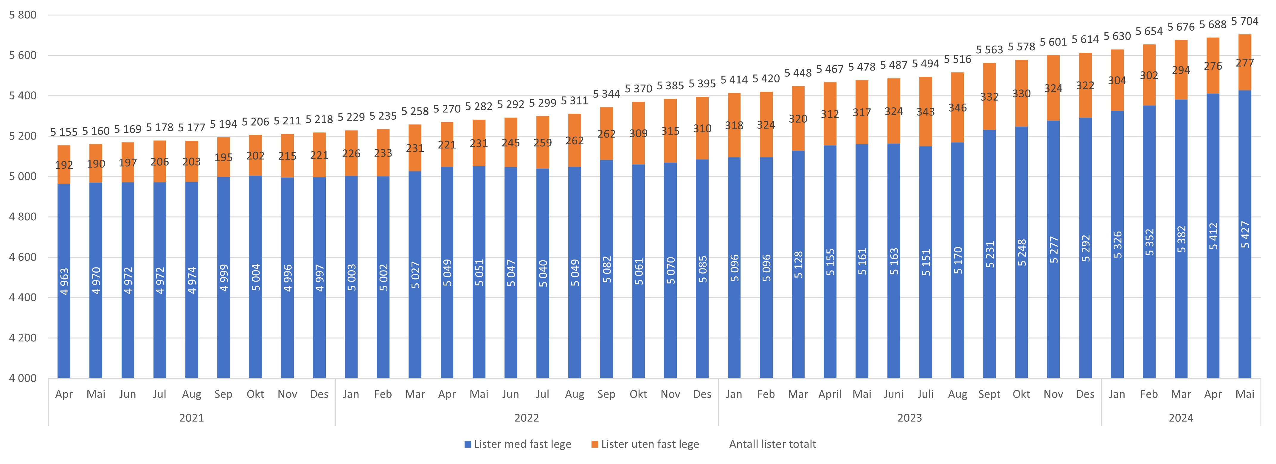 - Antall lister med fast lege har økt med 15 lister fra april til mai 2024 (figur 3 og 4). Per mai er antall lister med fast lege 5 427 lister, en økning på 135 lister hittil i 2024. Antall listeinnbyggere med fast lege har økt med omtrent 6 800 fra april til mai og med 59 000 hittil i år (se datagrunnlag).