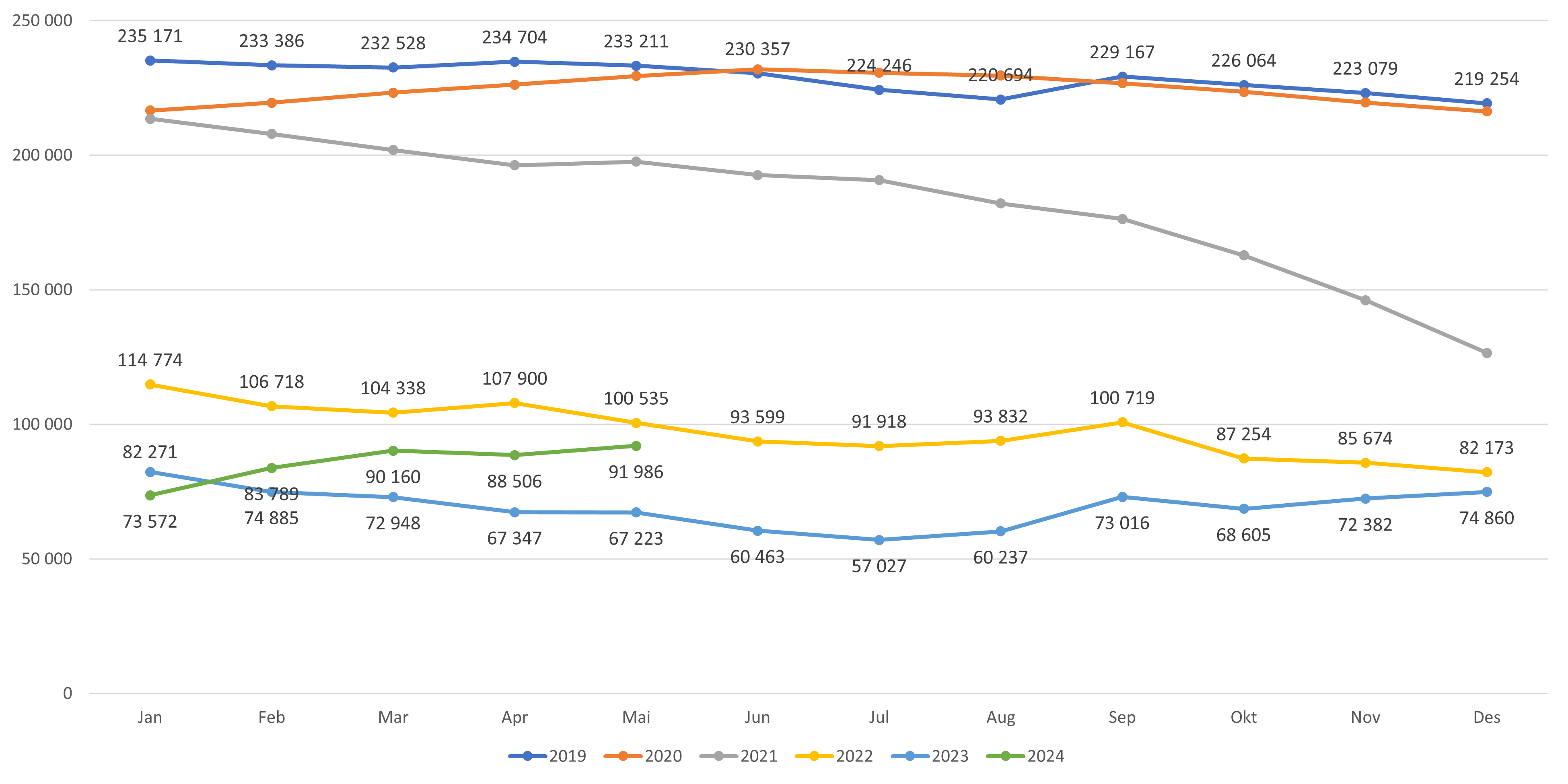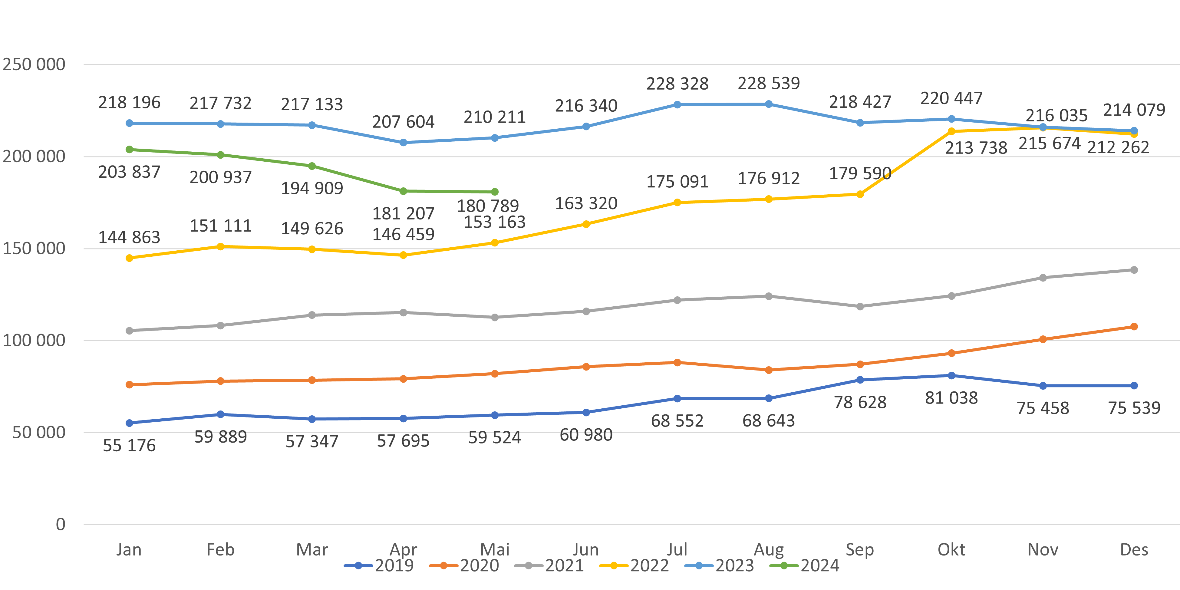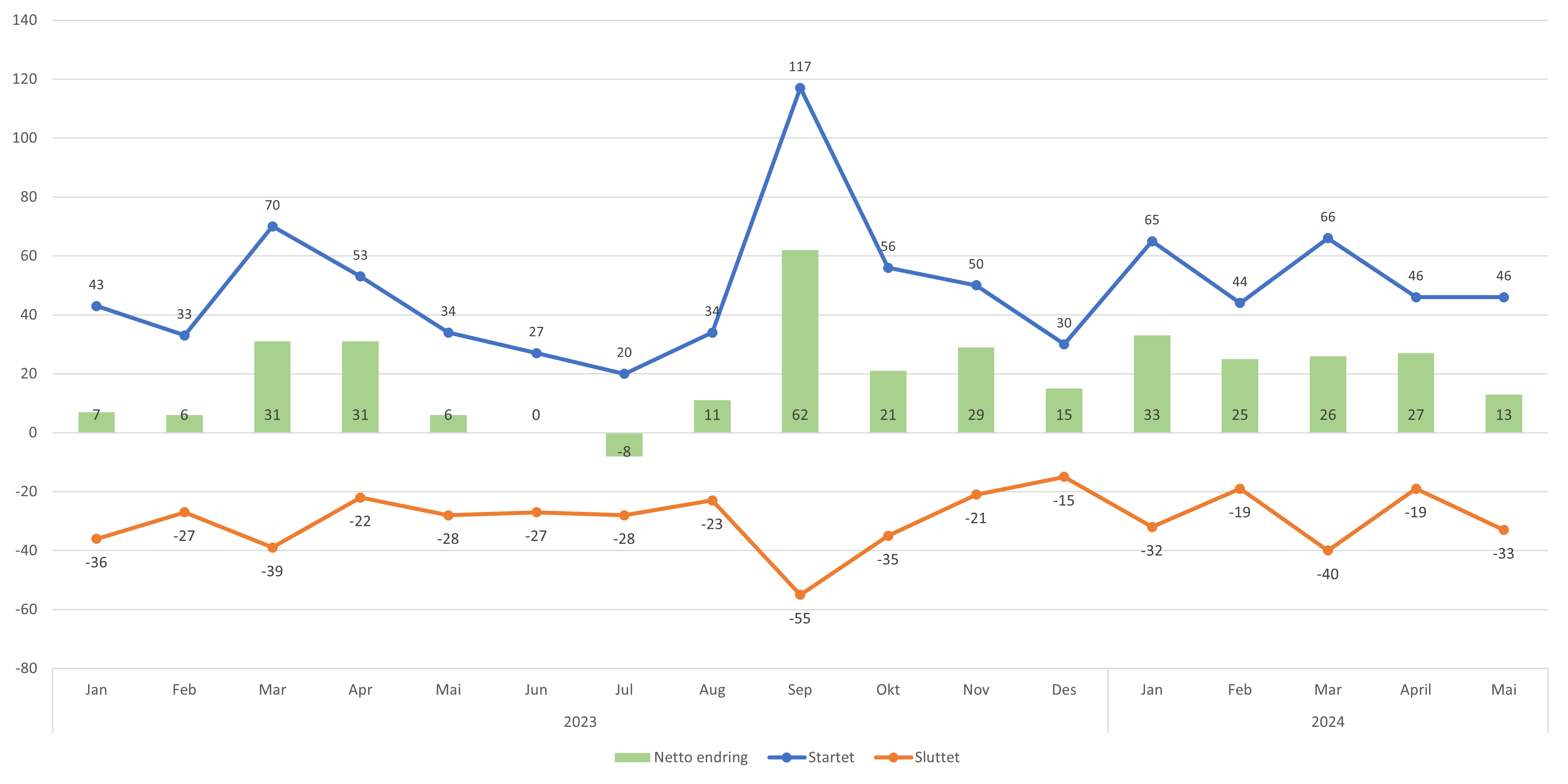 - Antall lister med fast lege har økt med 15 lister fra april til mai 2024 (figur 3 og 4). Per mai er antall lister med fast lege 5 427 lister, en økning på 135 lister hittil i 2024. Antall listeinnbyggere med fast lege har økt med omtrent 6 800 fra april til mai og med 59 000 hittil i år (se datagrunnlag).