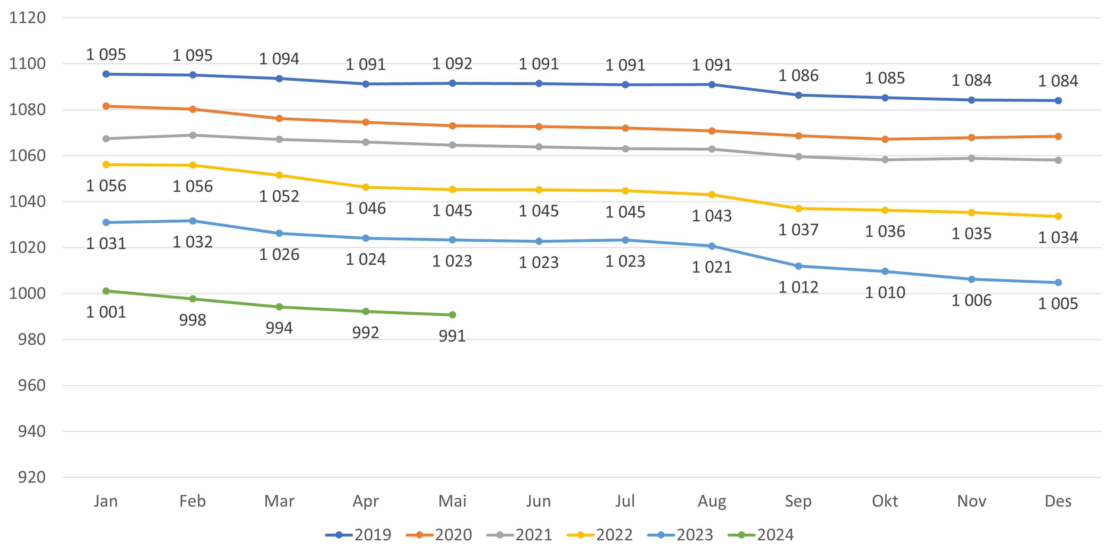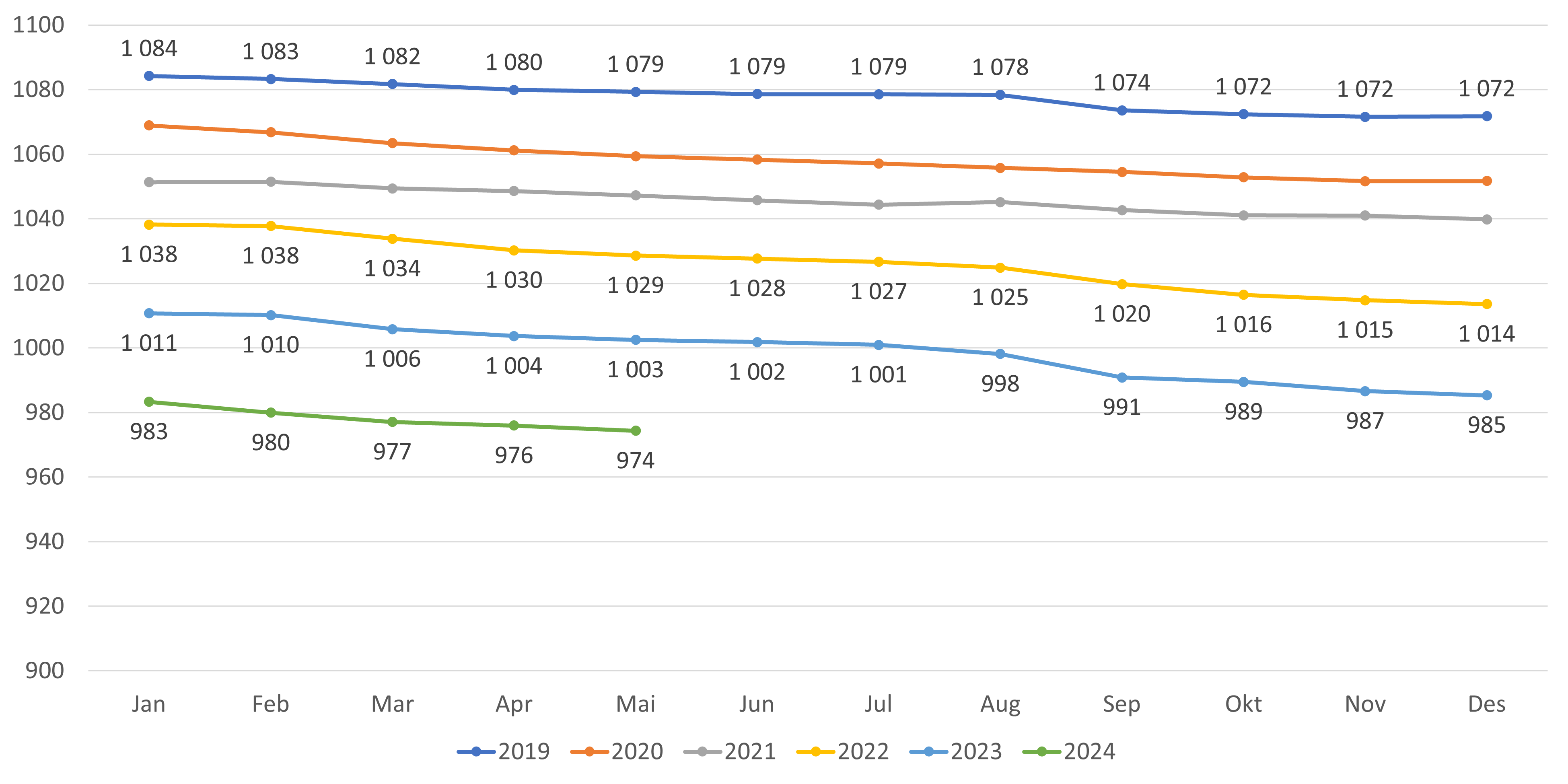 - Reduksjonen i gjennomsnittlig listelengde fortsetter i mai. For lister med fast lege har gjennomsnittlig listelengde gått ned fra 992 i april til 991 i mai (figur 7). Om man inkluderer alle lister går gjennomsnittet ned fra 976 i april til 974 i mai 2024 (figur 8).