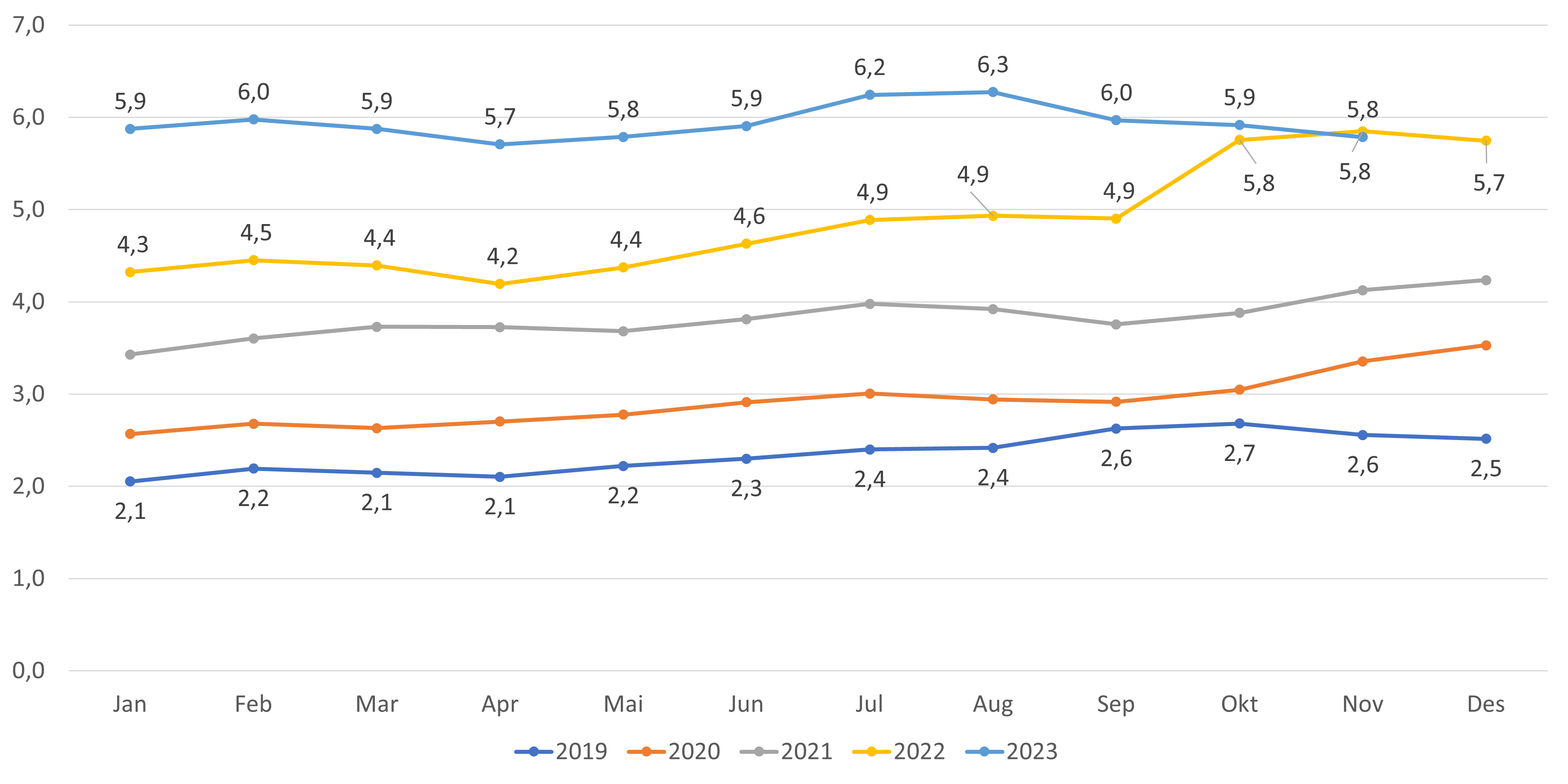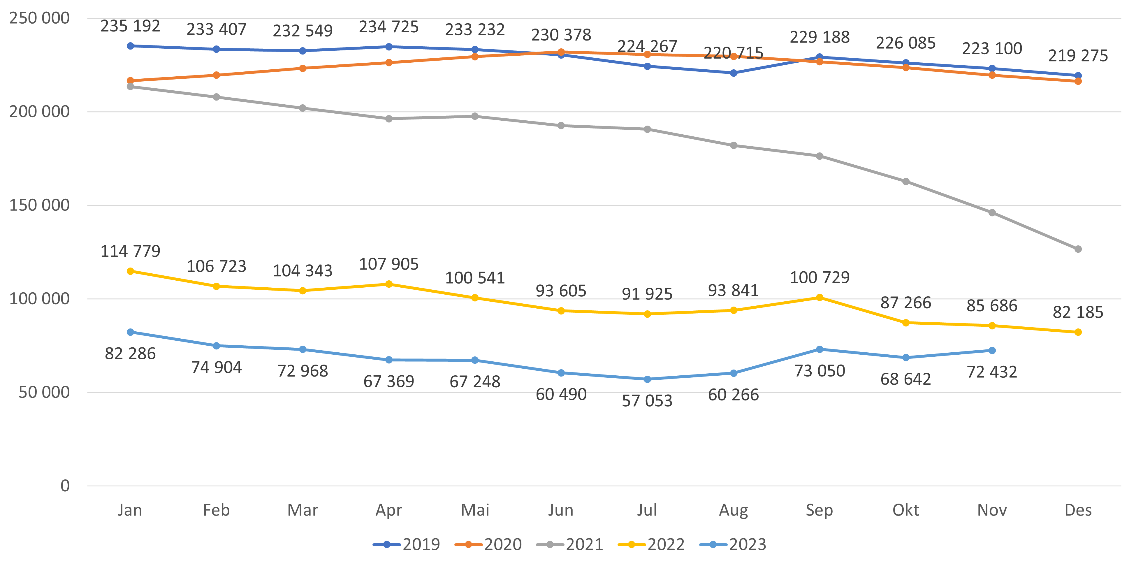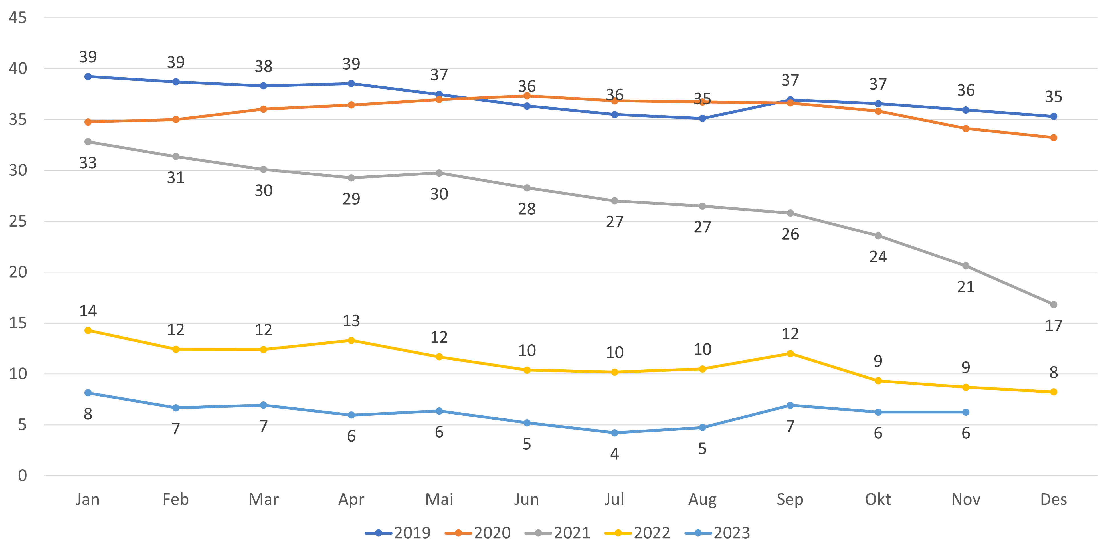 - Antall lister uten fast lege har gått ned med 6 lister fra oktober til november 2023 (figur 4 og 6). Hittil i år har antallet økt med 14 lister. Andel lister uten fast lege har gått ned fra 5,9 prosent til 5,8 prosent fra oktober til november 2023 (figur 7).