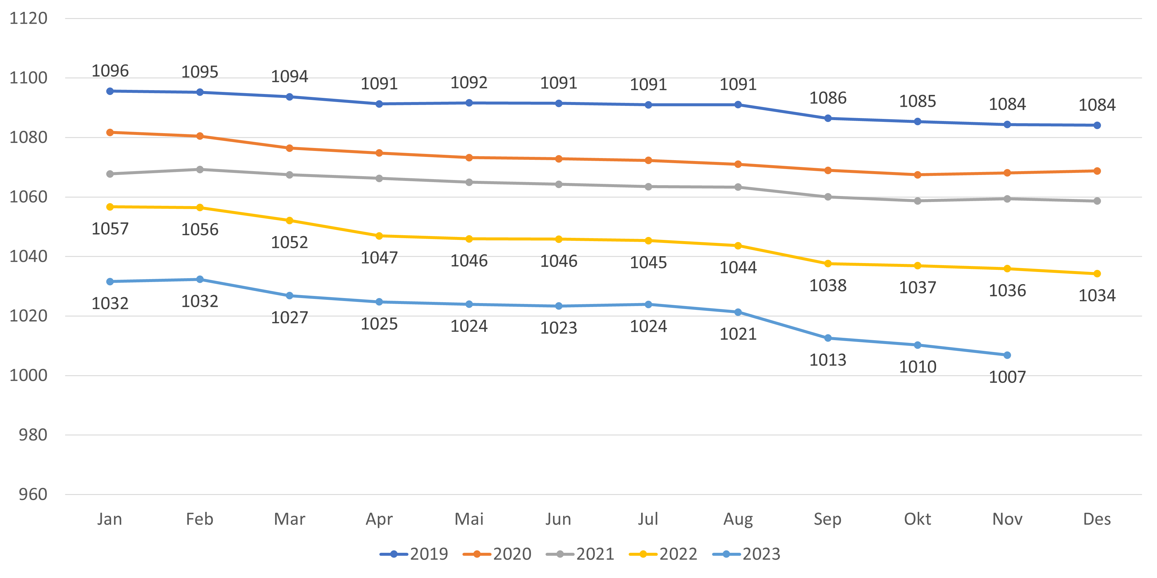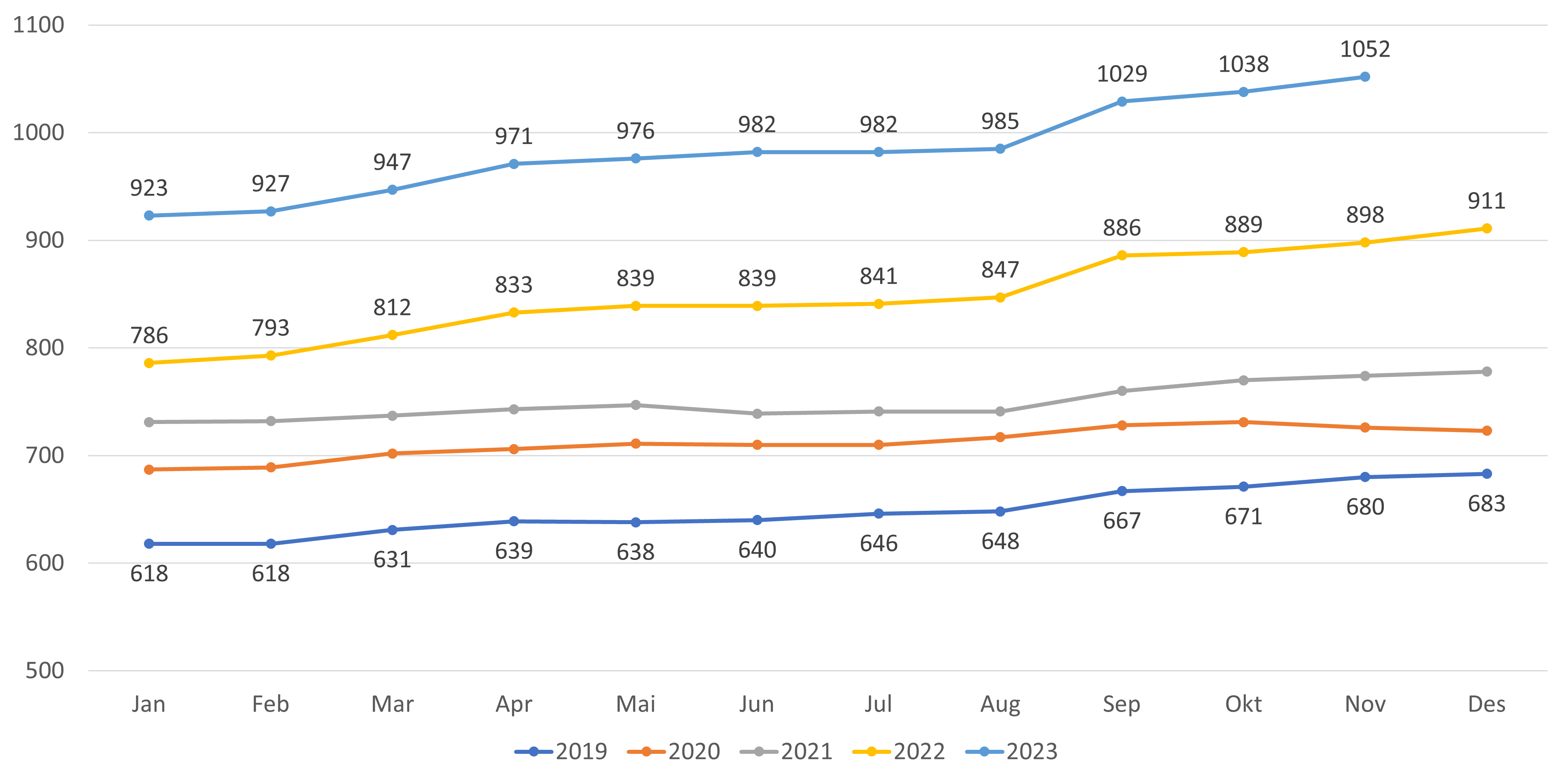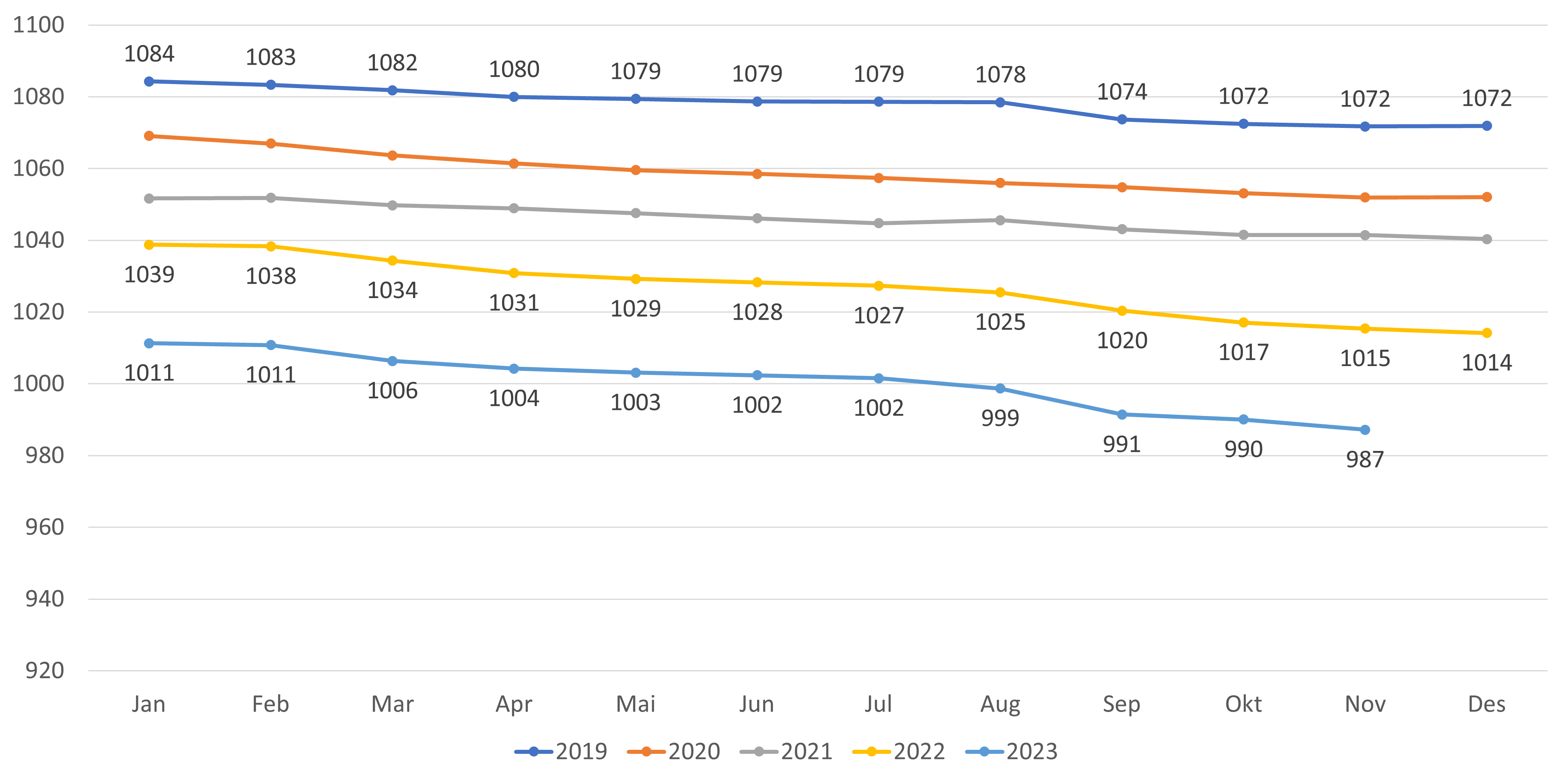- Reduksjonen i gjennomsnittlig listelengde har fortsatt fra oktober til november 2023. For lister med fast lege har gjennomsnittlig listelengde gått ned fra 1 010 til 1 007 fra oktober til november 2023 (figur 8). Om man inkluderer alle lister går gjennomsnittet ned fra 990 til 987 fra oktober til november 2023 (figur 9).