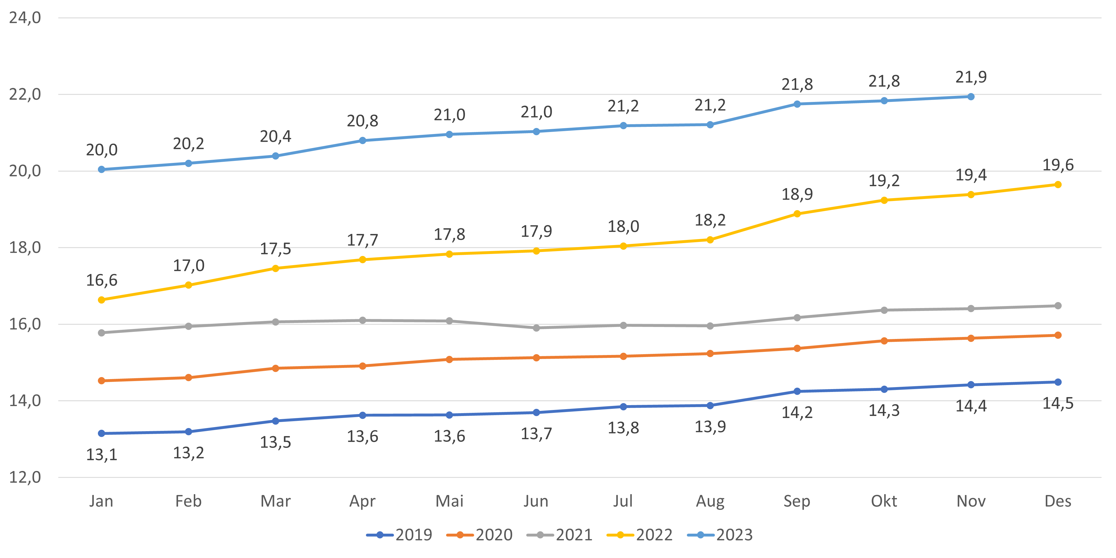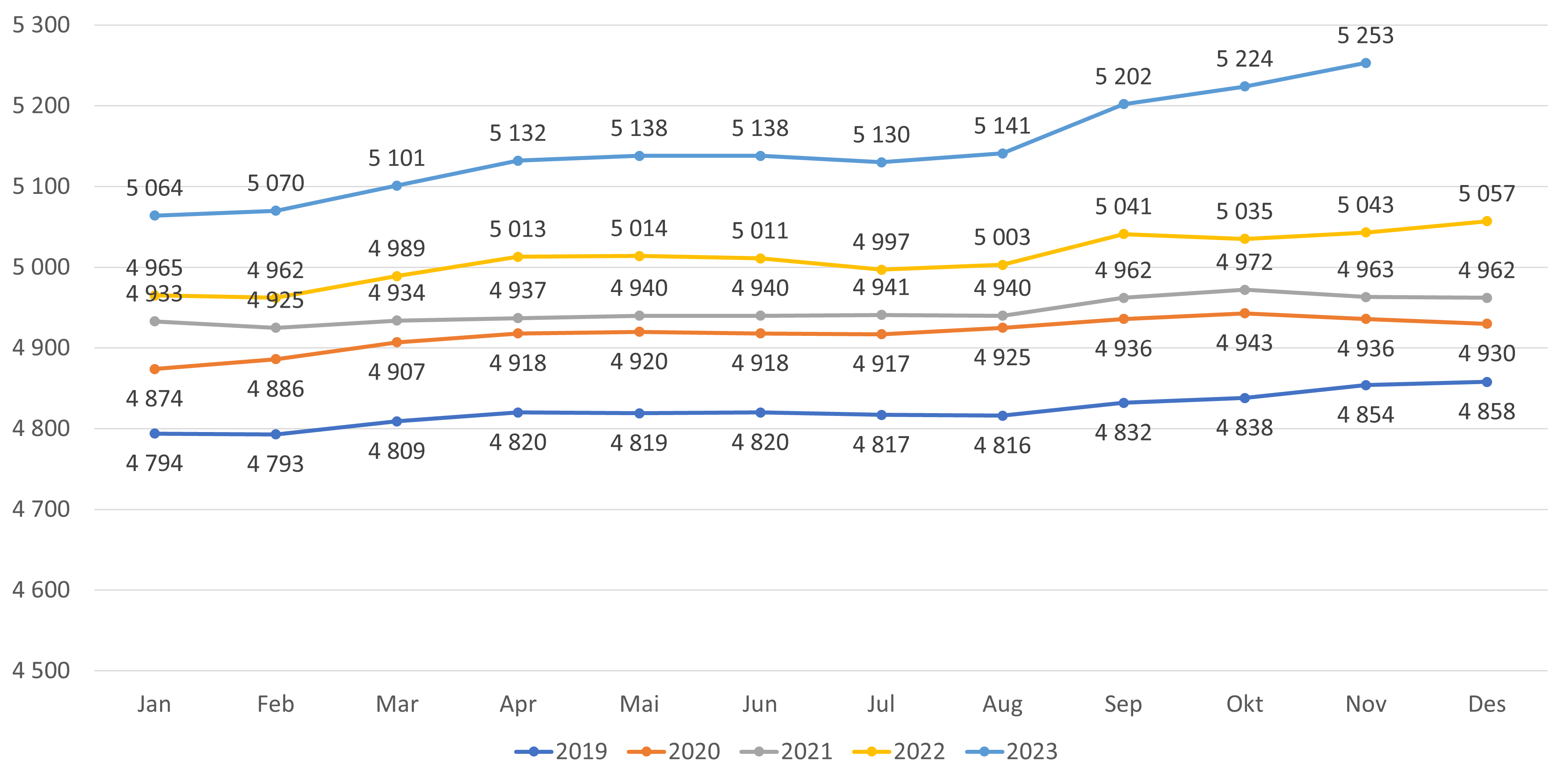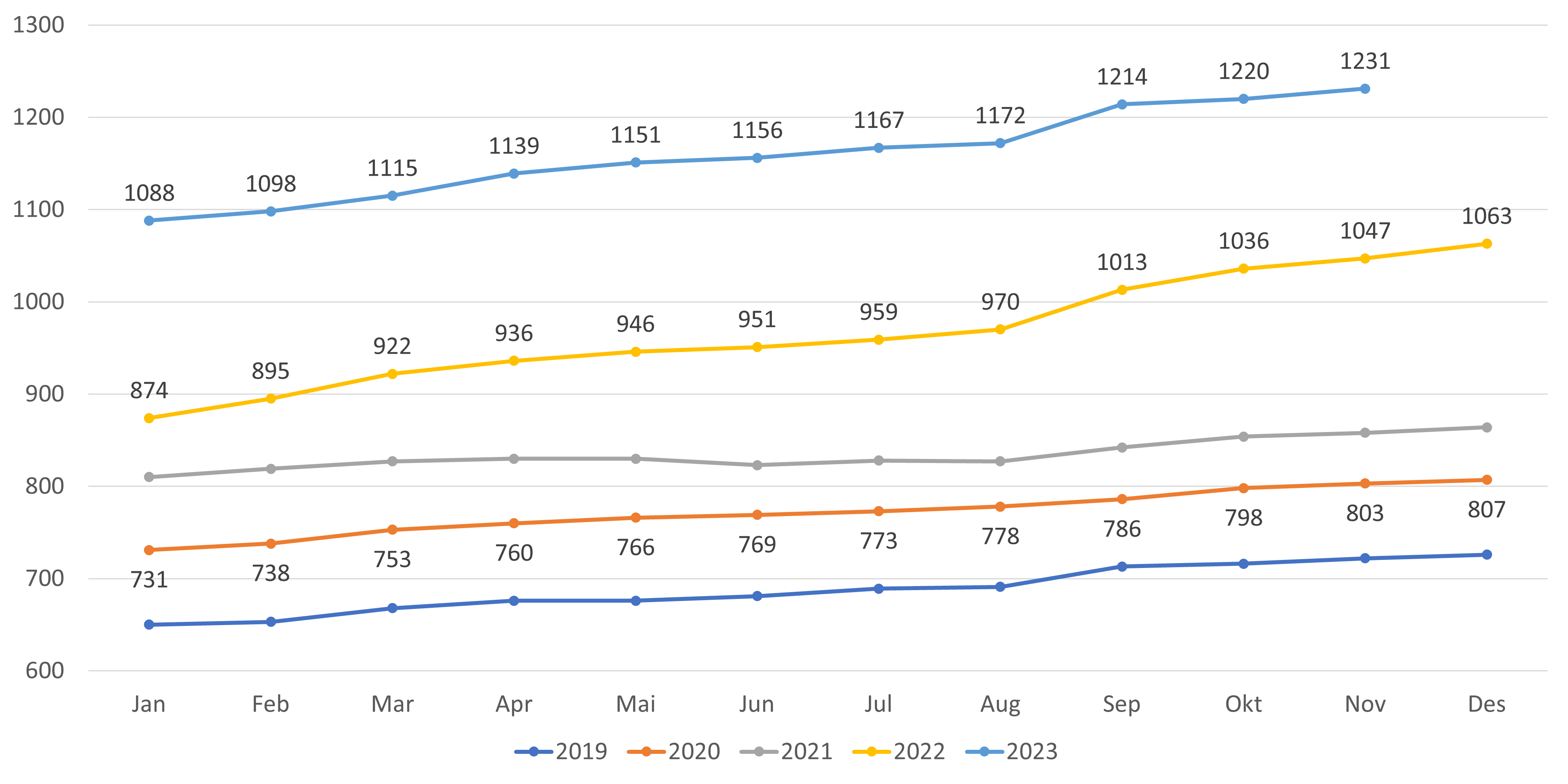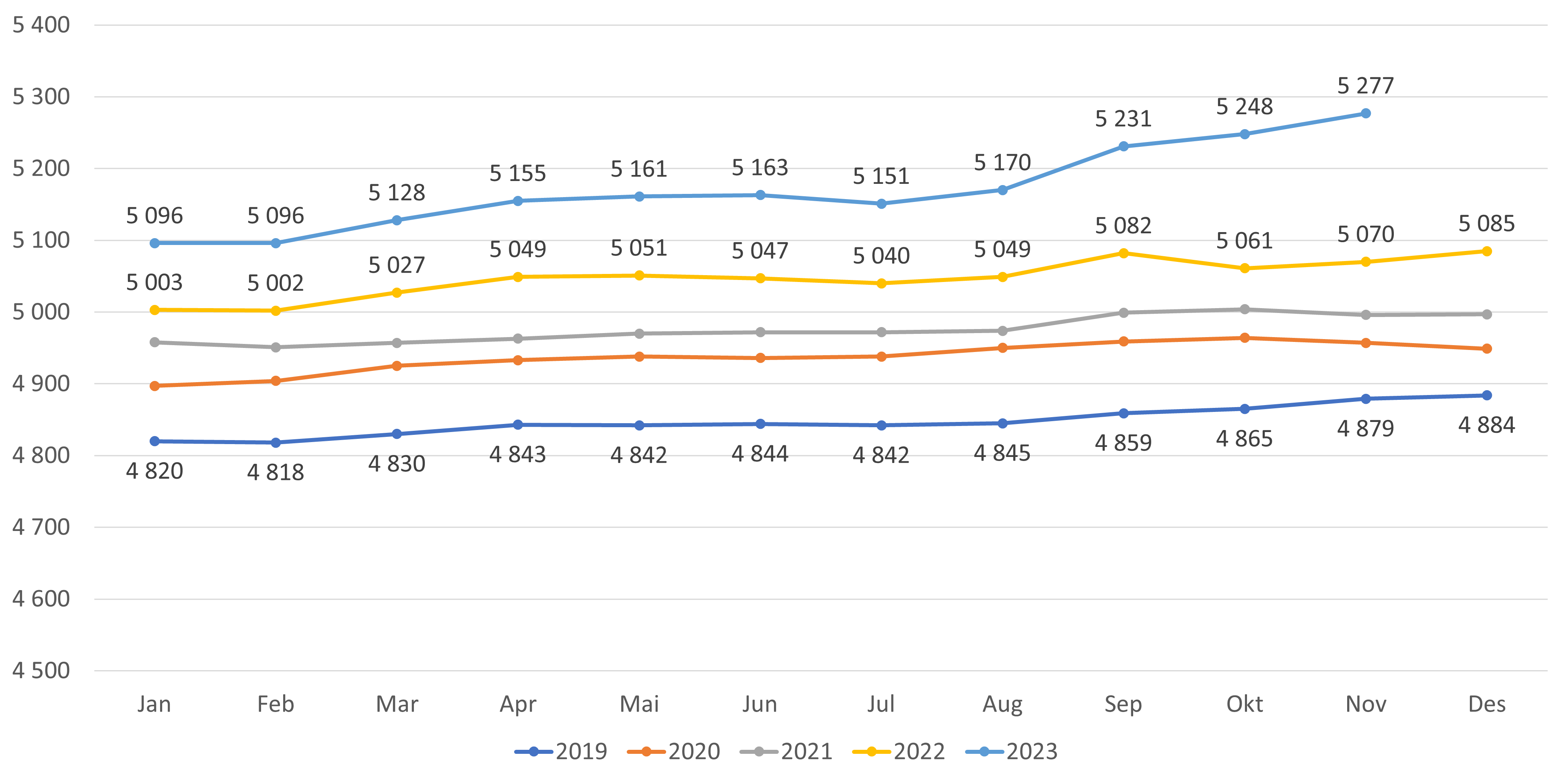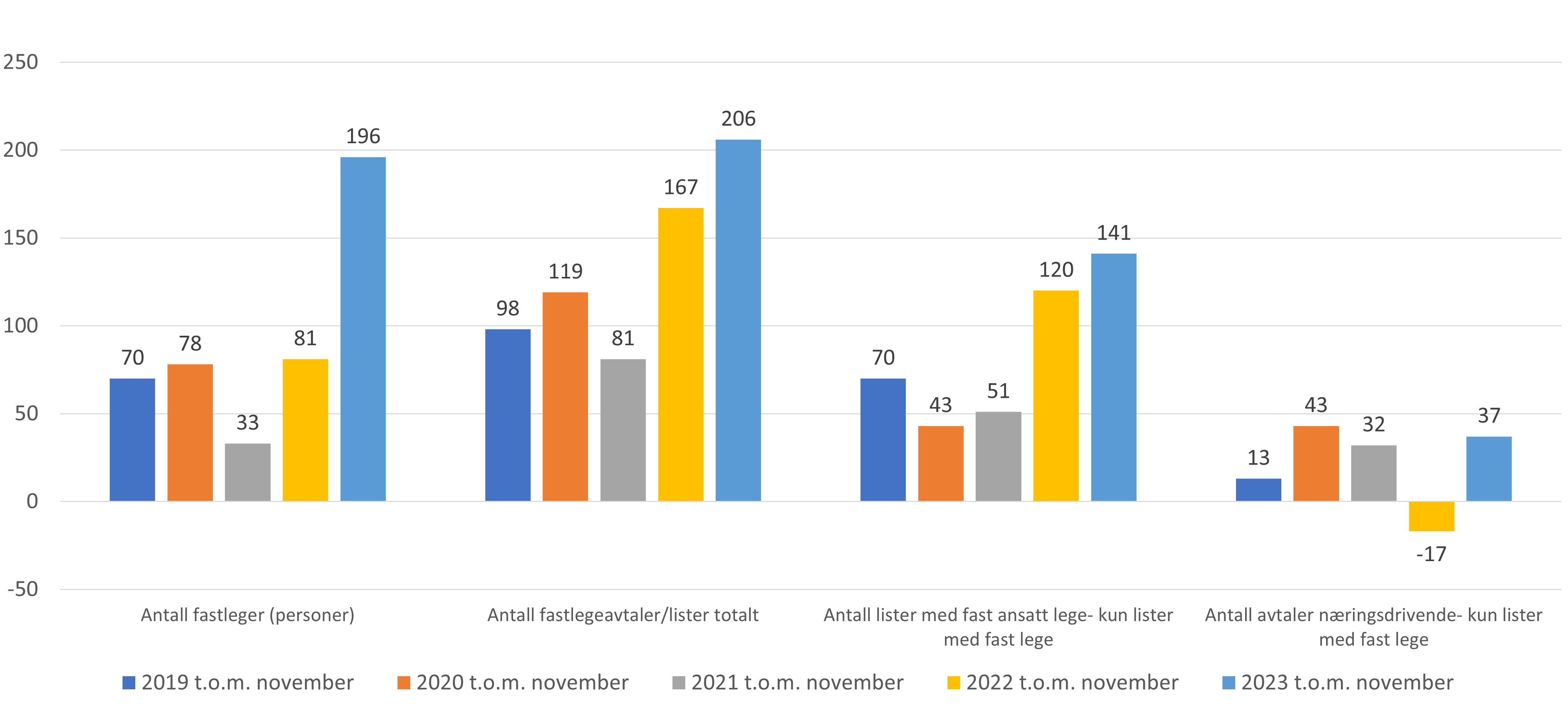 - Antall fastleger (personer) har økt med 29 fra oktober til november 2023 (figur 2). Hittil i 2023 har det vært en økning på 196 leger (figur 1).