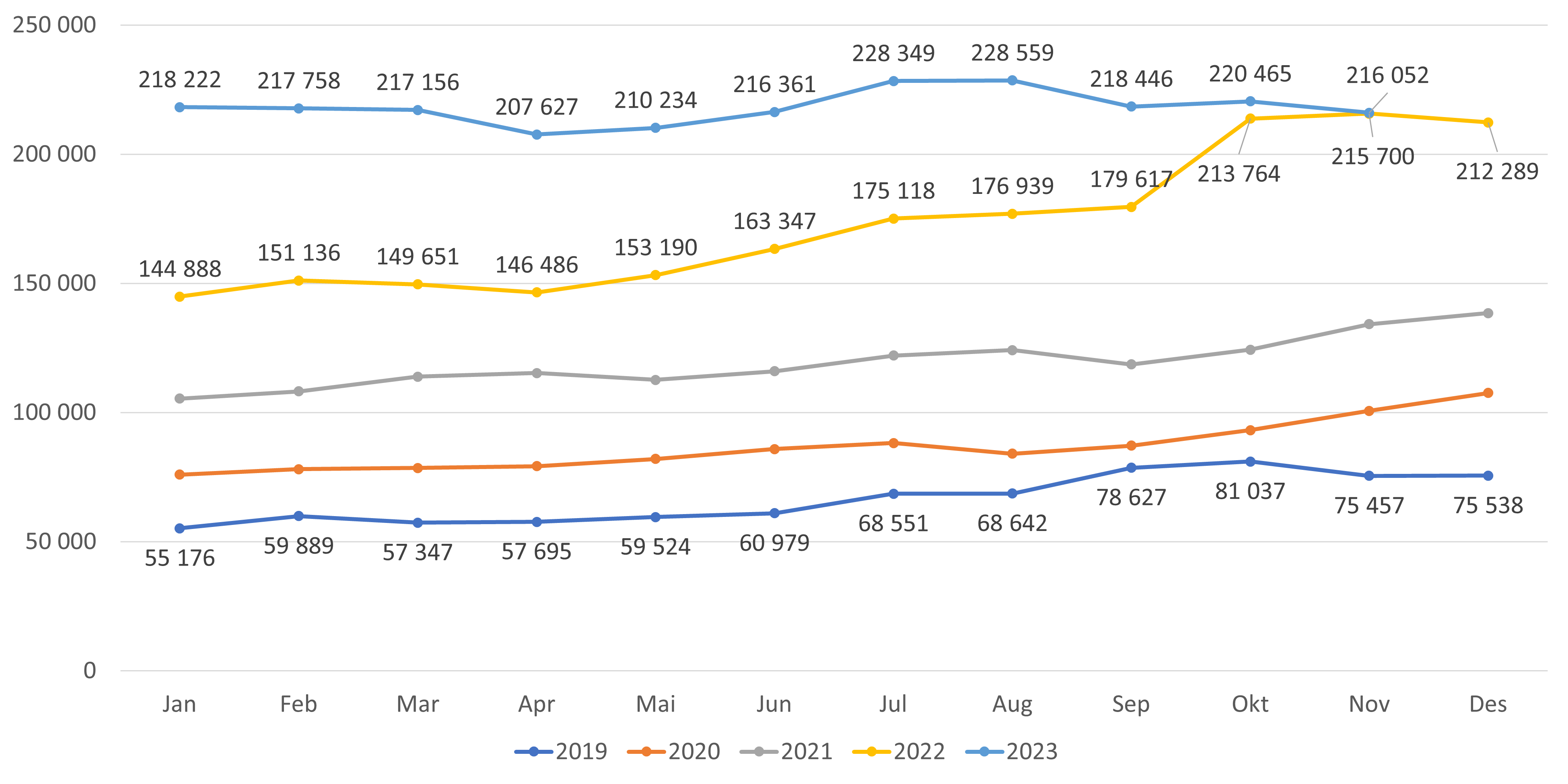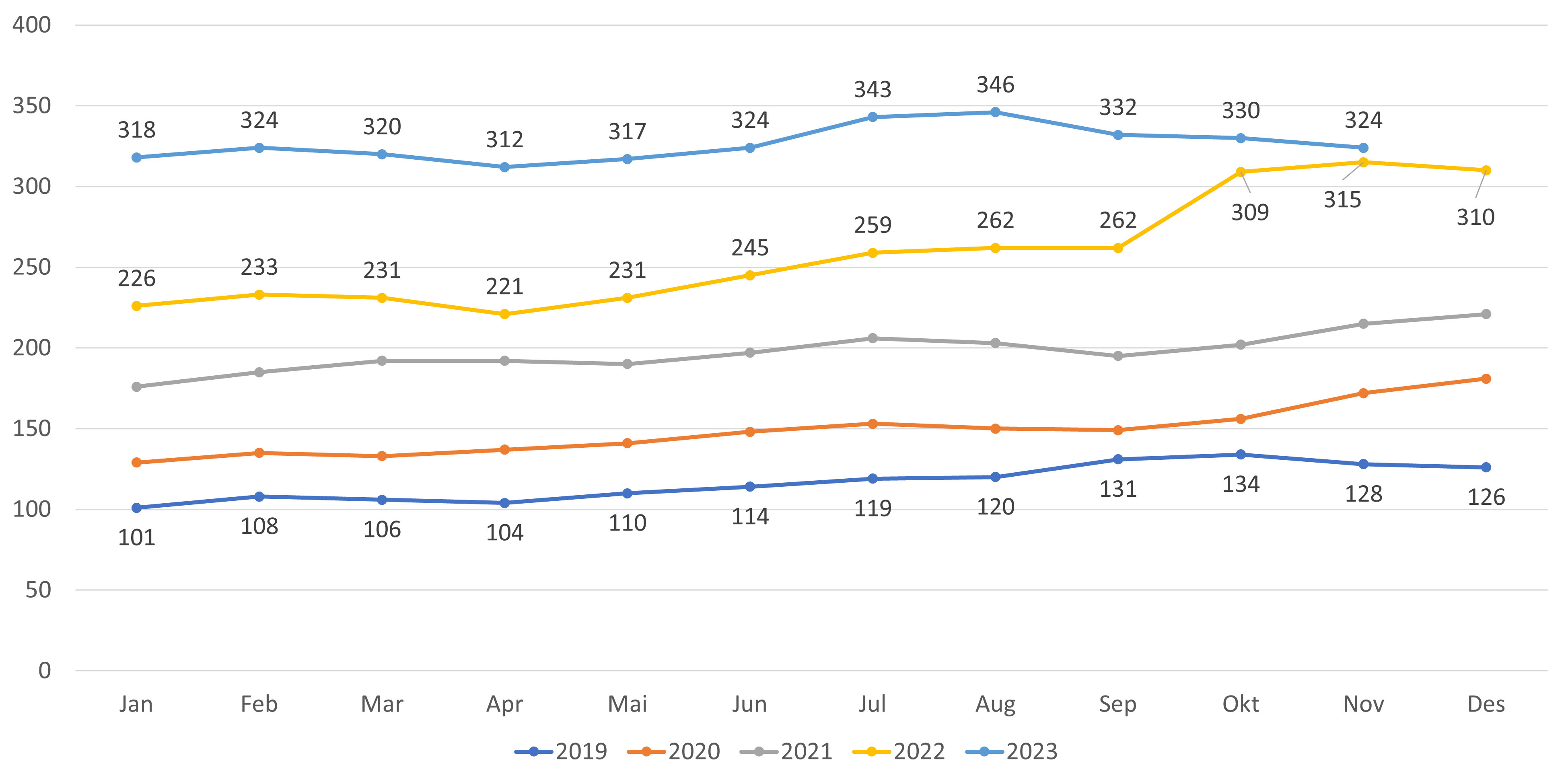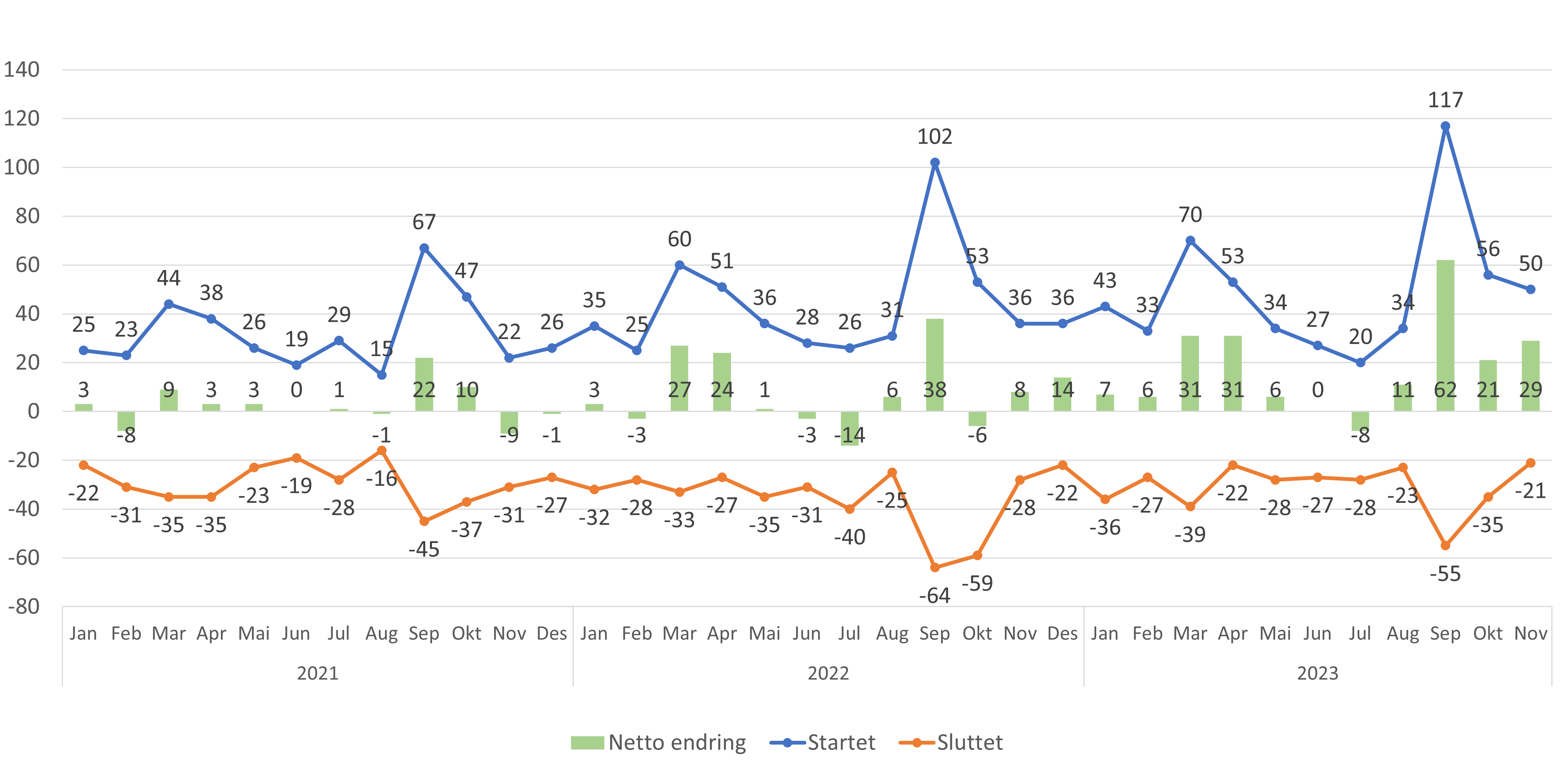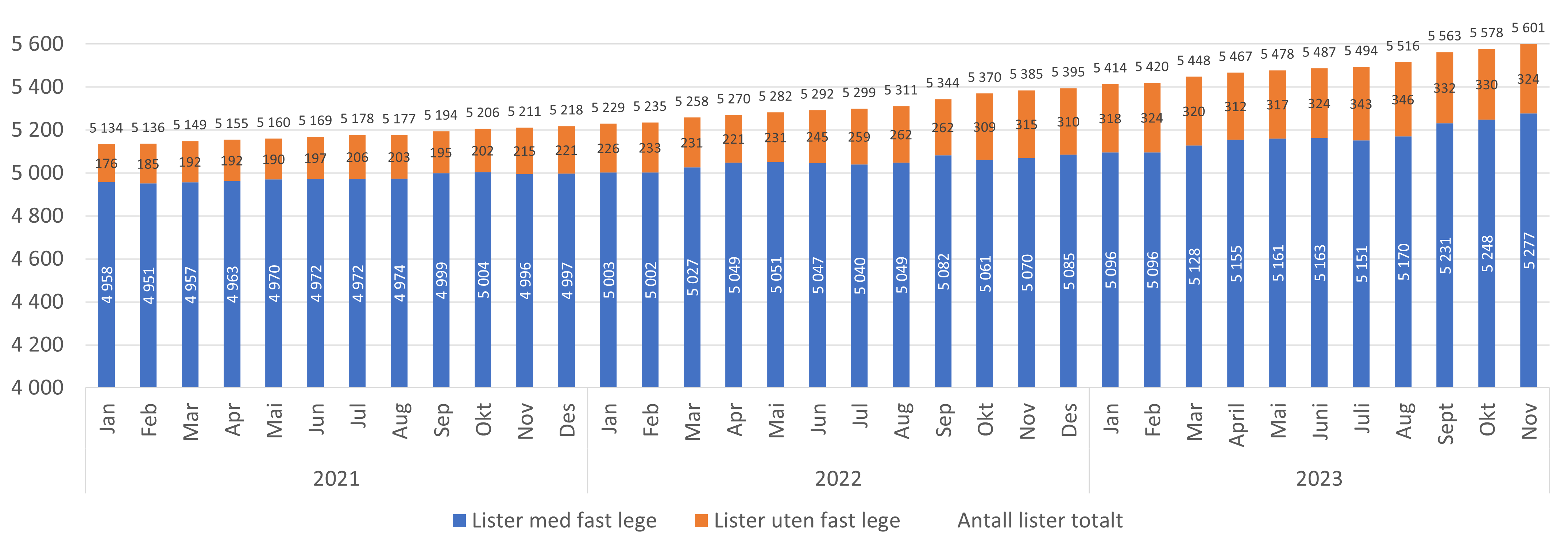 - Antall lister med fast lege har økt med 29 lister fra oktober til november 2023 (figur 4 og 5). Hittil i år har antall lister med fast lege økt med 192 lister.