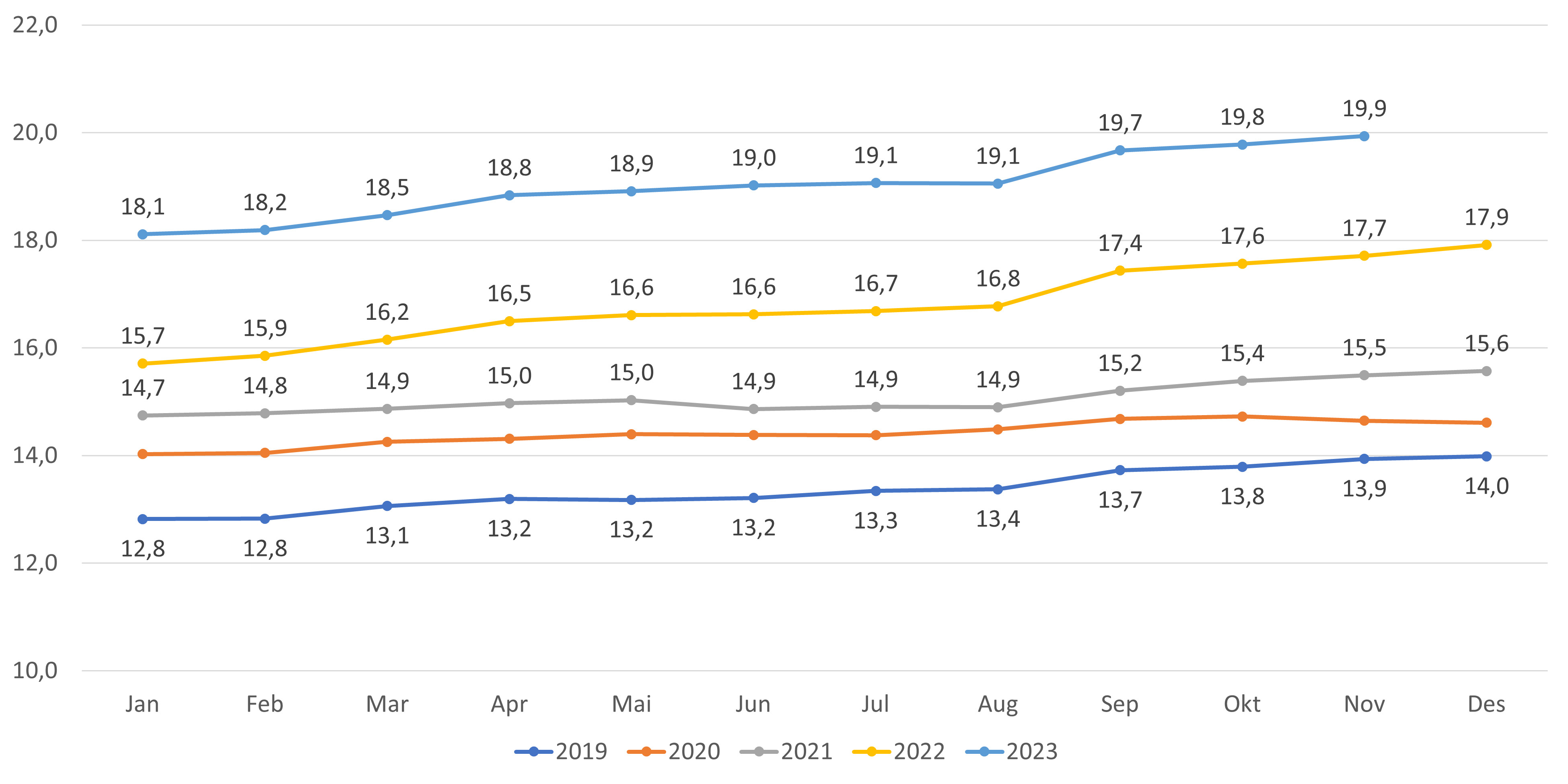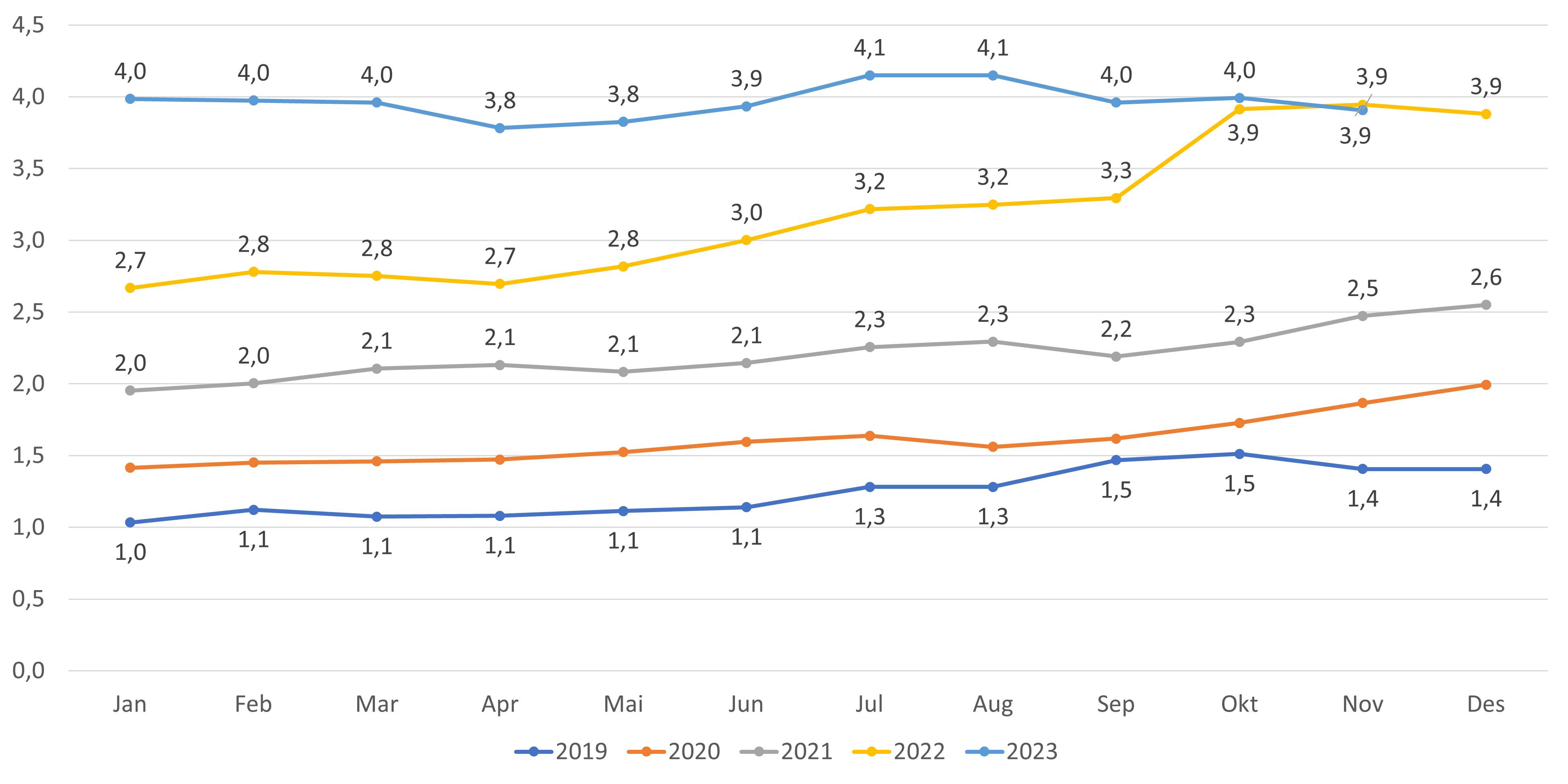- Antall innbyggere uten fast lege har gått ned fra oktober til november (- 4 413 innbyggere) (figur 14). Hittil i 2023 har antall innbyggere uten fast lege økt med 3 763 innbyggere. Andelen listeinnbyggerne på liste uten fast lege har gått ned fra 4,0 til 3,9 fra oktober til november (figur 15). Den betydelige veksten i antall og andel innbyggere uten fast lege fra starten av september 2022 til starten av oktober 2022 skyldes Helfos oppfordring til kommunene om å melde inn ubesatte lister.