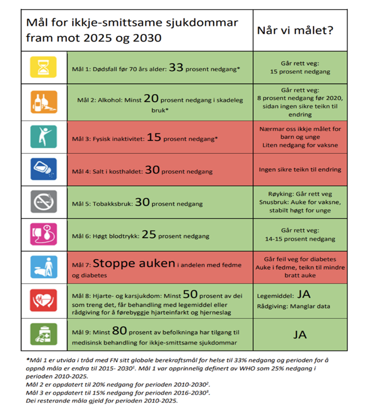Norge hatt 15 prosent reduksjon i for tidlige dødsfall av de ikke-smittsomme sykdommene kreft, hjerte- og karsykdom, kronisk lungesykdom og diabetes fra 2015 til 2022 i aldersgruppen mellom 30 og 69 år. Nedgangen er i hovedsak knyttet til færre dødsfall av hjerte- og karlidelser og kreft. For diabetes type 2 og fedme går imidlertid utviklingen feil vei, og andelen voksne personer med fedme er nå 20-25 prosent. Andel av befolkningen som er fysisk inaktive har gått noe ned, men 80 prosent av den voksne befolkningen er fortsatt stillesittende mer enn 8 timer hver dag. Potensialet for å øke tiden brukt til fysisk aktivitet er derfor stort.