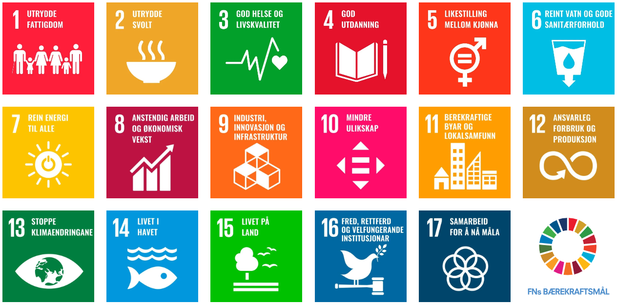 FNs Bærekraftsmål Figur 2‑2 FNs 17 mål mot bærekraftig utvikling 2030 er et forsøk på å samle verden om et sett av felles mål for en bærekraftig utvikling. En bærekraftig samfunnsutvikling er en utvikling som kan vedvare over tid uten å forringe nåværende eller kommende generasjoners muligheter. Bærekraft inkluderer både økonomiske, miljømessige og sosiale forhold. På samme måte som man må ta hensyn til flere generasjoner og samfunnsgrupper, må man planlegge på tvers av sektorer og ta hensyn til både økonomiske, miljømessige og sosiale aspekter.