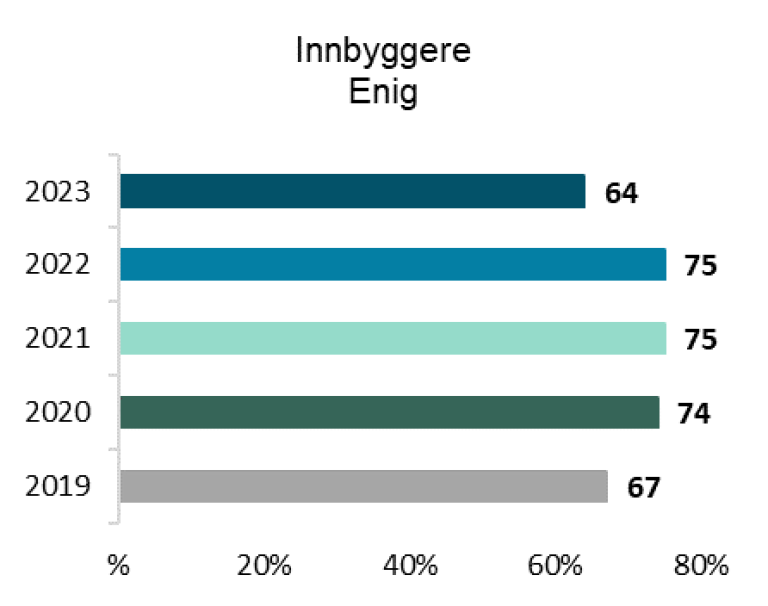 Figurnote 1. Innbyggerundersøkelsen: Siden 2023 har innbyggere hatt mulighet for å svare «verken enig eller uenig». Det har bidratt til redusert enig-andel (og redusert uenig-andel) fra 2022 til 2023.