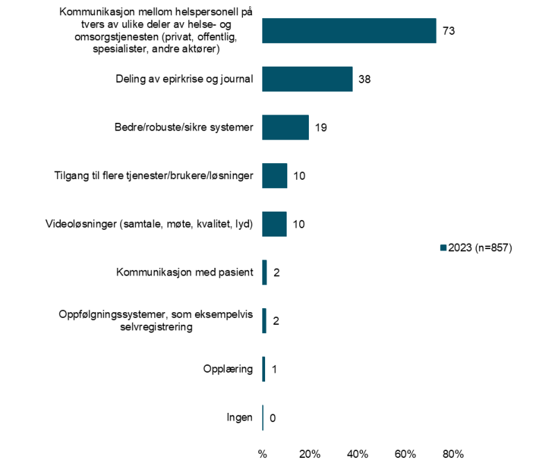 Kommunikasjon mellom helsepersonell på tvers av ulike deler av helse- og omsorgstjenesten er klart hyppigst oppgitte udekkede behov for digital kommunikasjon med annet helsepersonell om behandling av pasient. I dette ligger blant annet deling på tvers, inkludert mellom avdelinger i samme virksomhet og kommunikasjon på tvers av helseregioner. Helsepersonell opplever videre udekkede behov for deling av epikrise og journal og ønsker seg bedre og robuste systemer.
