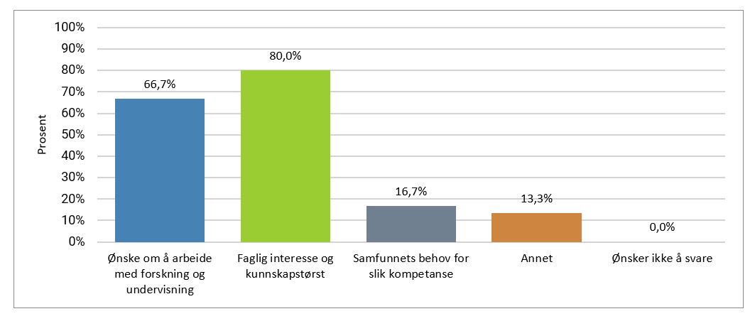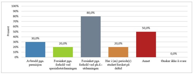 Av de 3 (10 %) som ikke har fullført, har 1 fullført ph.d.-utdanningen og 2 har fullført spesialistutdanningen. På spørsmål om hvorfor de har avsluttet uten å fullføre, oppgir 1 personlige grunner, 2 svarer "annet".