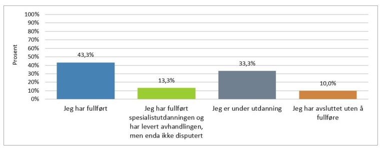 - 5 av dem hadde fullført spesialistutdanning, levert avhandling, men ikke disputert