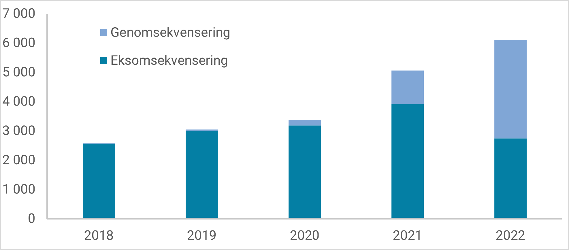Teknologisk utvikling gjør det stadig billigere og enklere å gjøre genomanalyser. Som vist i figuren nedenfor, tas genomundersøkelser i bruk i økende grad. Håndtering av data som genereres og analyse av sekvensene reiser en rekke problemstillinger som vi blant annet har pekt på i vår evaluering av bioteknologiloven fra 2011 og 2015[41]. Det er utfordrende å analysere og tolke resultatene fra slike analyser, det kan gis informasjon om prediktiv sykdom og det reiser en rekke etiske problemstillinger. Tolking av genomdata er komplisert, og innen fagområdet medisinsk genetikk krever dette spesialkompetanse i medisinsk genetikk og laboratoriegenetikk. På kreftområdet vil kompetanse innen molekylærpatologi og molekylærbiologi være svært sentralt.