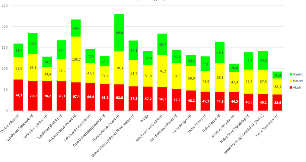 I 2021 var det registrert 299 ambulansestasjoner i Norge, som ble betjent av 543 ambulansebiler. Prosentmålene til høyre i figuren indikerer at ingen av RHFene oppnådde den veiledende målsettingen om at ambulansetjenesten skal være fremme ved hendelsesstedet ved 90% av alle akuttoppdrag inn 12 og 25 minutter fra det ringer hos AMK, i henholdsvis tettbygde og grisgrendte strøk.
