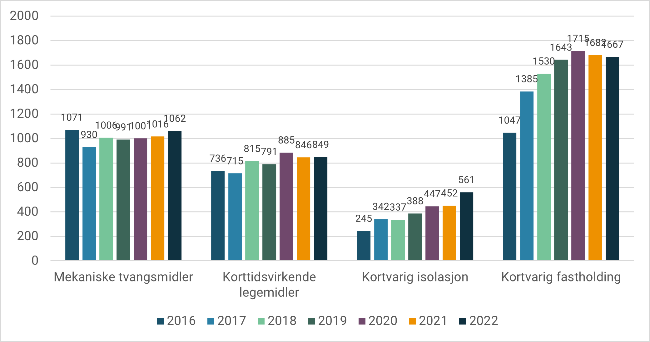 Vi har ikke lett tilgjengelige data på antall gjennomføringsvedtak, men tall fra nasjonale kvalitetsindikatorer (NKI)[6] viser antall pasienter som har fått vedtak om bruk av tvangsmidler etter § 4-8 (inkluderer ikke skjerming). Antall pasienter som har fått minst ett vedtak om tvangsmiddelbruk har økt i perioden 2016-2022. Fram til 2020 var det størst vekst i antall pasienter med vedtak om kortvarig fastholding, men antallet har gått litt ned siste to år. I 2022 var det størst vekst i antall pasienter med vedtak om kortvarig isolasjon. Se figur 11.