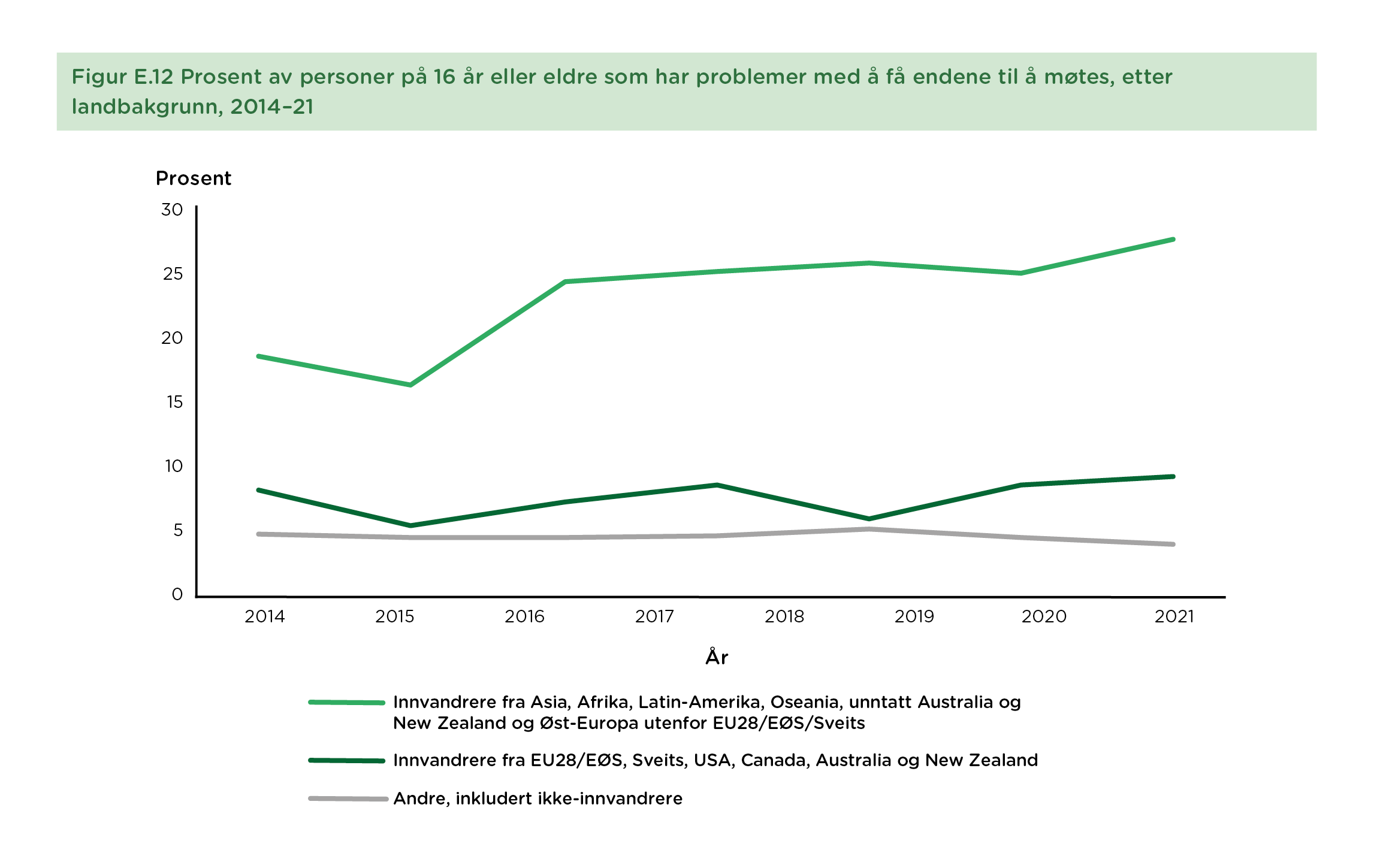 Faktorer som opprinnelsesland, årsakene til migrasjon (dvs. flyktninger og asylsøkere sammenlignet med økonomiske migranter), samt oppholdstid i Norge er assosiert med ulikheter i levekår og helse. Figur E.12 viser sammenhengen med problemer med å få endene til å møtes.