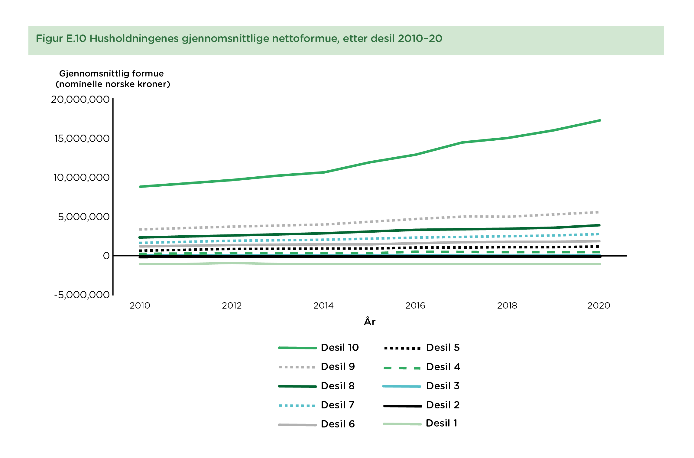 Formuen til de øverste 10 prosentene har økt markant siden 2010, mens formuen til de nederste 50 prosentene knapt har økt. Formuesgradienten blir stadig brattere, som vist i figur E.10. Mens de fattigste 20 prosentene ikke har noen akkumulert formue, har den akkumulerte formuen økt hos de aller rikeste.