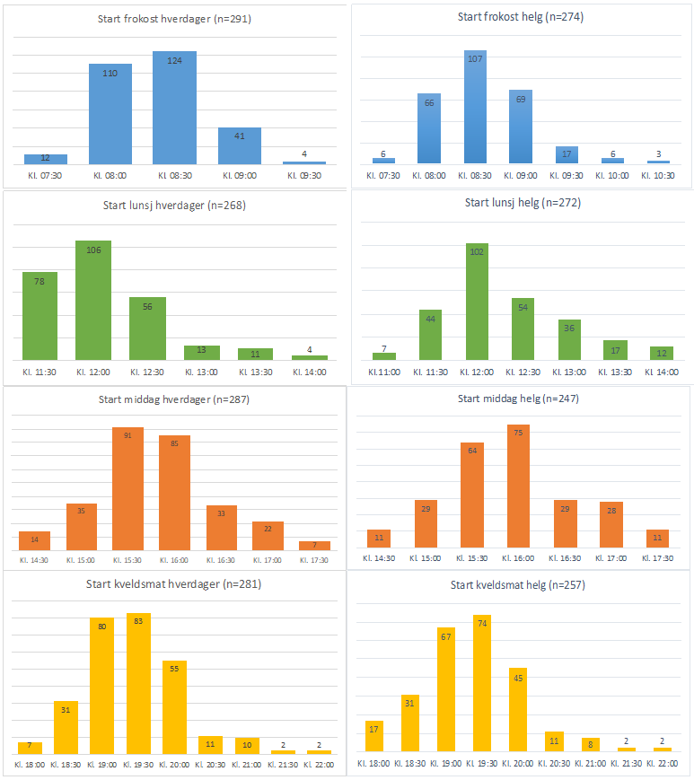 De fleste sengepostledere svarte at frokost på hverdager starter før kl. 09.00 (85% av n=291), mens 65% (av n=274) svarte at frokosten på helg starter før kl. 09.00 (Figur 13). På hverdager ble servering av lunsj rapportert av de fleste til kl. 11.30 eller 12.00 (69%) og til kl. 12.00 eller 12.30 på helg (57%). Middagen ble hos de fleste servert kl. 15.30 eller kl. 16.00 på både hverdager (61%) og helg (56%). Kveldsmaten ble rapportert av de fleste å starte kl. 19.00 eller kl. 19.30 (58% på hverdager og 55% på helg).