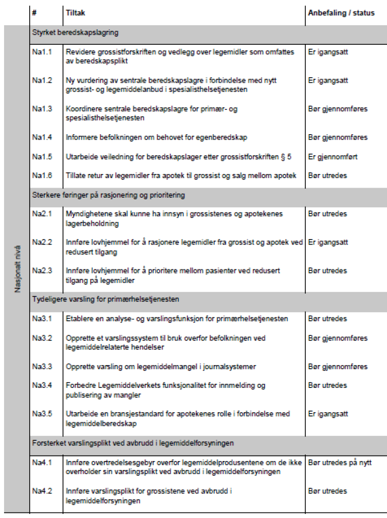 | Tiltak Na.1.1 Revidere grossistforskriften og vedlegg over legemidler som omfattes av beredskapsplikt | |