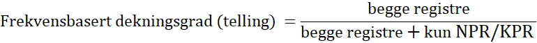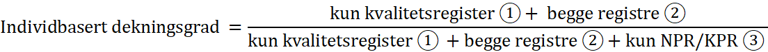Ved beregning av dekningsgrad utgjør summen av 1, 2 og 3 det maksimale antallet observasjoner. Altså inngår også observasjoner som kun er i kvalitetsregisteret i totalen. Se formel 1 for dekningsgrad i kvalitetsregistre nedenfor. Antall observasjoner i kvalitetsregisteret er summen av de som kan kobles med NPR og de som kun er i kvalitetsregisteret. Ved utregning av NPR/KPRs dekningsgrad byttes kategori 1 med 3 i brøkens teller. Dekningsgraden varierer mellom 0 og 100 %.